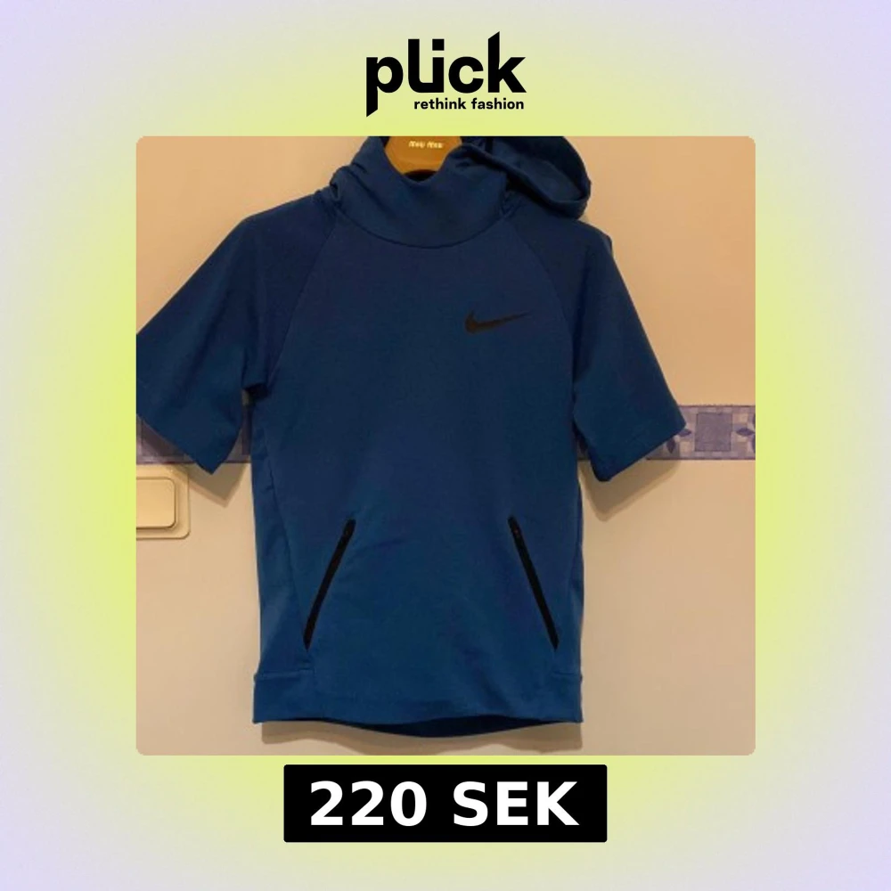 Säljer en blå hoodie från Nike med korta ärmar. Perfekt för träning eller en avslappnad dag. Den har en svart Nike-logga på bröstet och dragkedjefickor framtill. Nike tech modell!