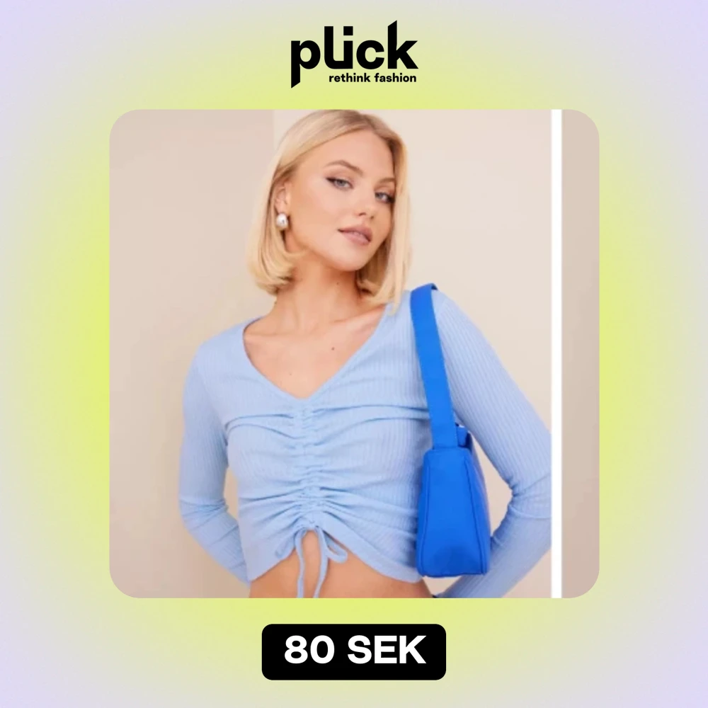 Ljusblå ribbad långärmad tröja i storleken XS. Köpt på Vero Moda och är i mycket bra skick. (Går att dra ihop snörena så tröjan blir kortare)