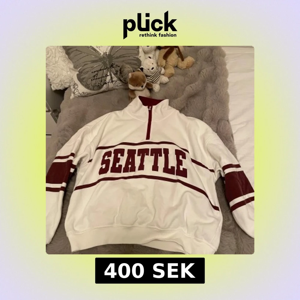 Säljer en vit sweatshirt från STAY med röd text 'SEATTLE' och röda detaljer på ärmarna. Tröjan har halv dragkedja vid halsen och ribbade muddar. Perfekt för en avslappnad stil.