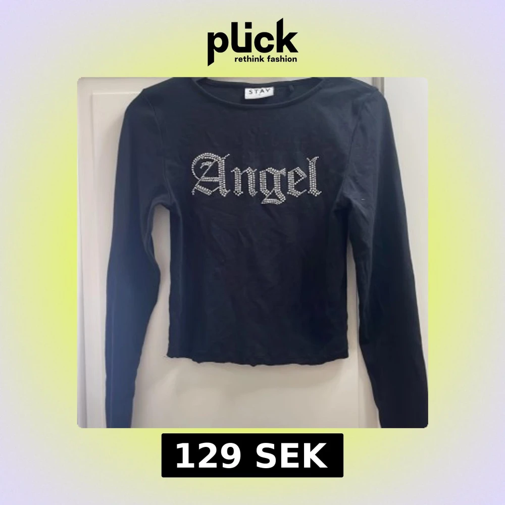 Svart långärmad topp från STAY i storlek S med stenar på bröstet där det står 'Angel'. Tunn och mjuk bomullskvalitet. Passformen är normal/tajt och har en klassisk rund hals. Det är bara att skriva om du har frågor. I nytt skick då den knappt använts🤗finns inga defekter heller❣️