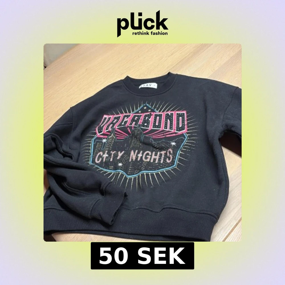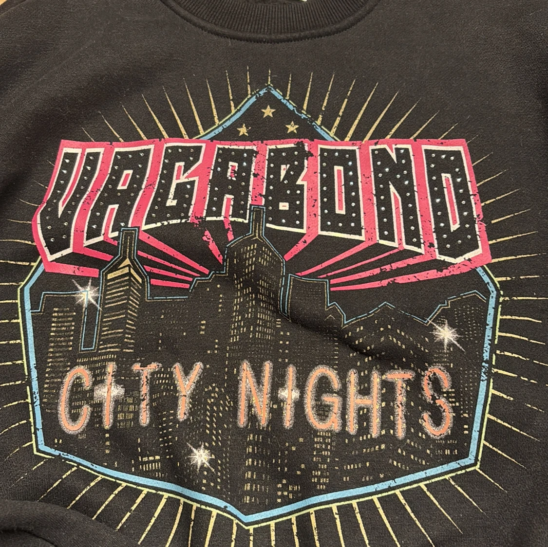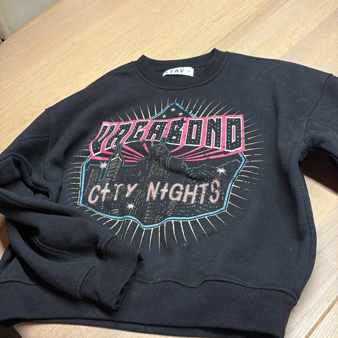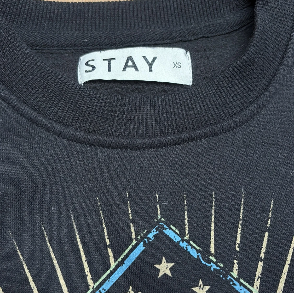 Cool svart sweatshirt från STAY i storlek XS med färgstarkt tryck på framsidan som säger 'VAGABOND CITY NIGHTS' och motiv av stadssilhuett, stjärnor och neonfärger. Tröjan har rund hals och långa ärmar, perfekt för dig som gillar streetstyle.