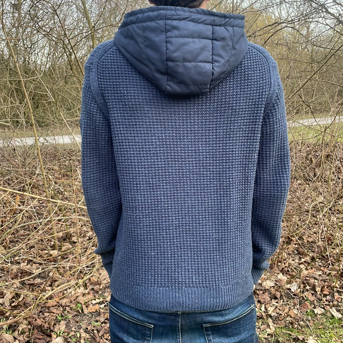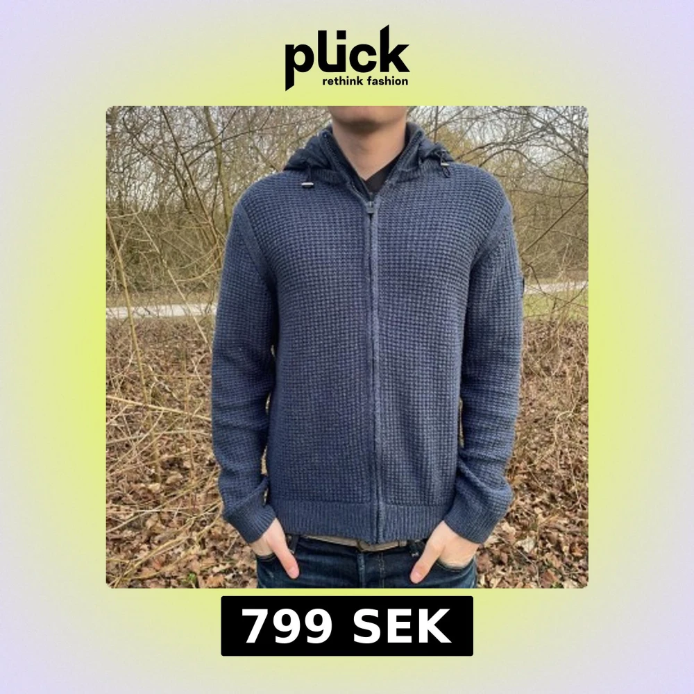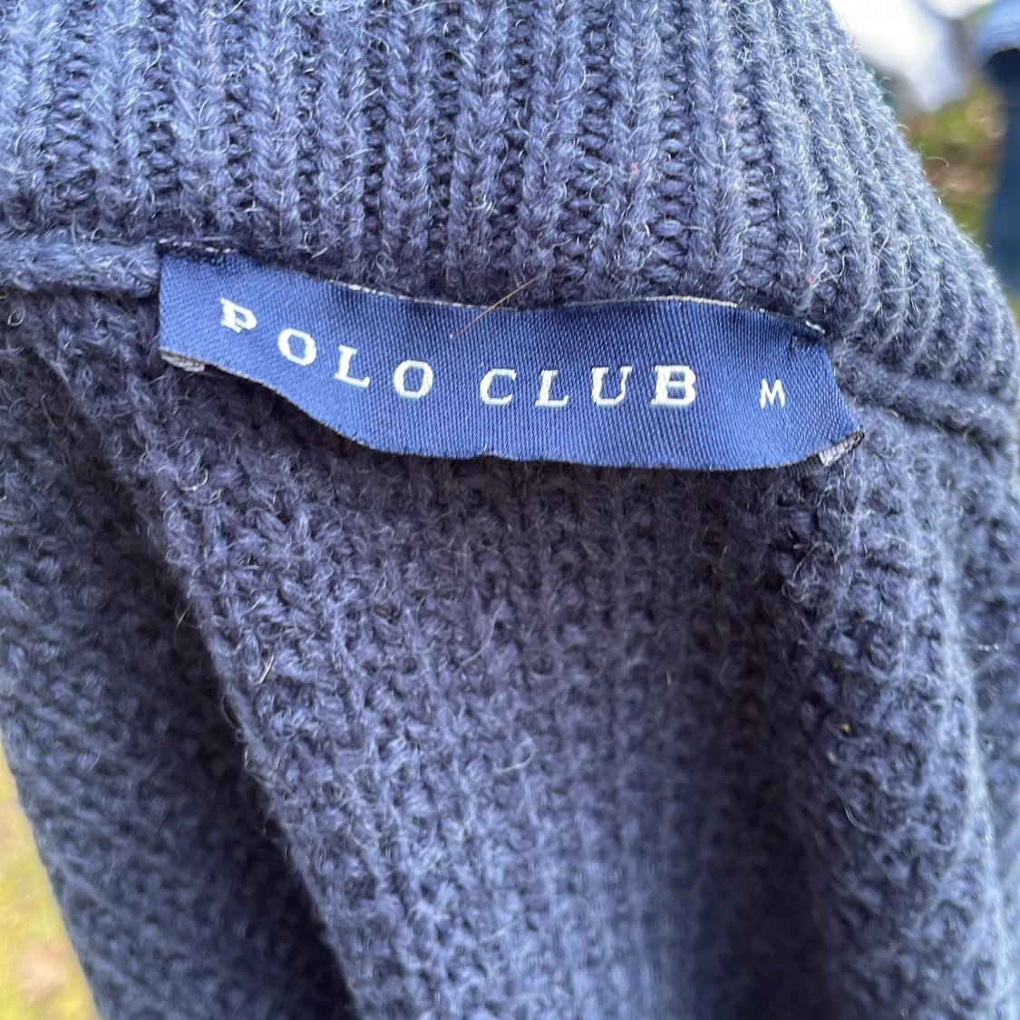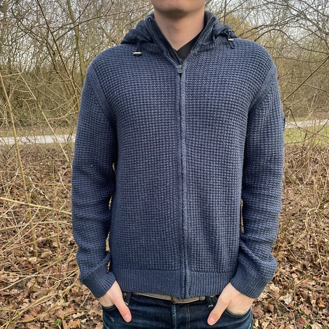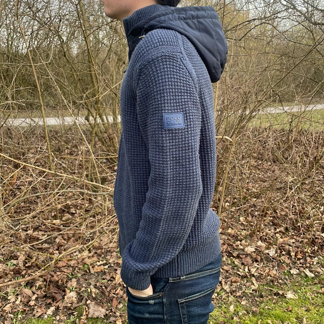 Säljer en snygg blå stickad cardigan från Polo Club. Tröjan har en dragkedja framtill och en quiltad huva. Perfekt för kyliga dagar med sin stilrena design och bekväma passform. Lite nopprig