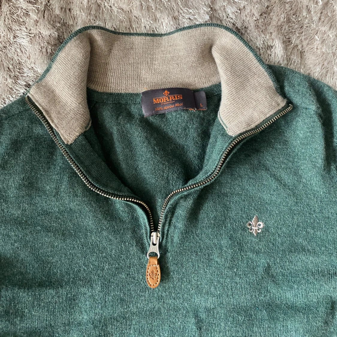 Grön Morris zip 100% merinoull. Skick 8/10. Strl L men krympt ner till S/XS den passar mig men är liten som 180cm