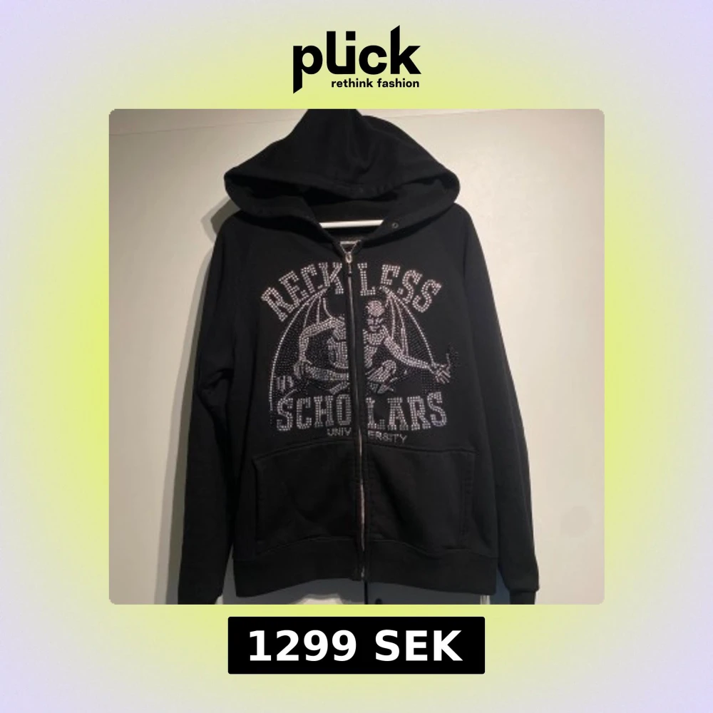 Klassiska Zip hoodien från Reckless Scholars med Rhinestones Slutsåld sedan länge och svår att få tag på. Storlek S men passar M. Välanvänd men i fint skick och så gott som alla stenar kvar. Fler bilder finns i DM. Hörs vid frågor!