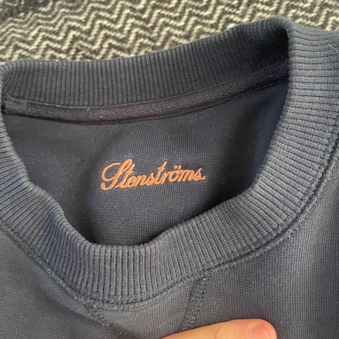 Säljer en mörkblå sweatshirt från Stenströms med broderad logga framtill. Tröjan har rund halsringning, långa ärmar och är tillverkad i mjuk bomull. Perfekt för en avslappnad och stilren look. Nypris 2300kr