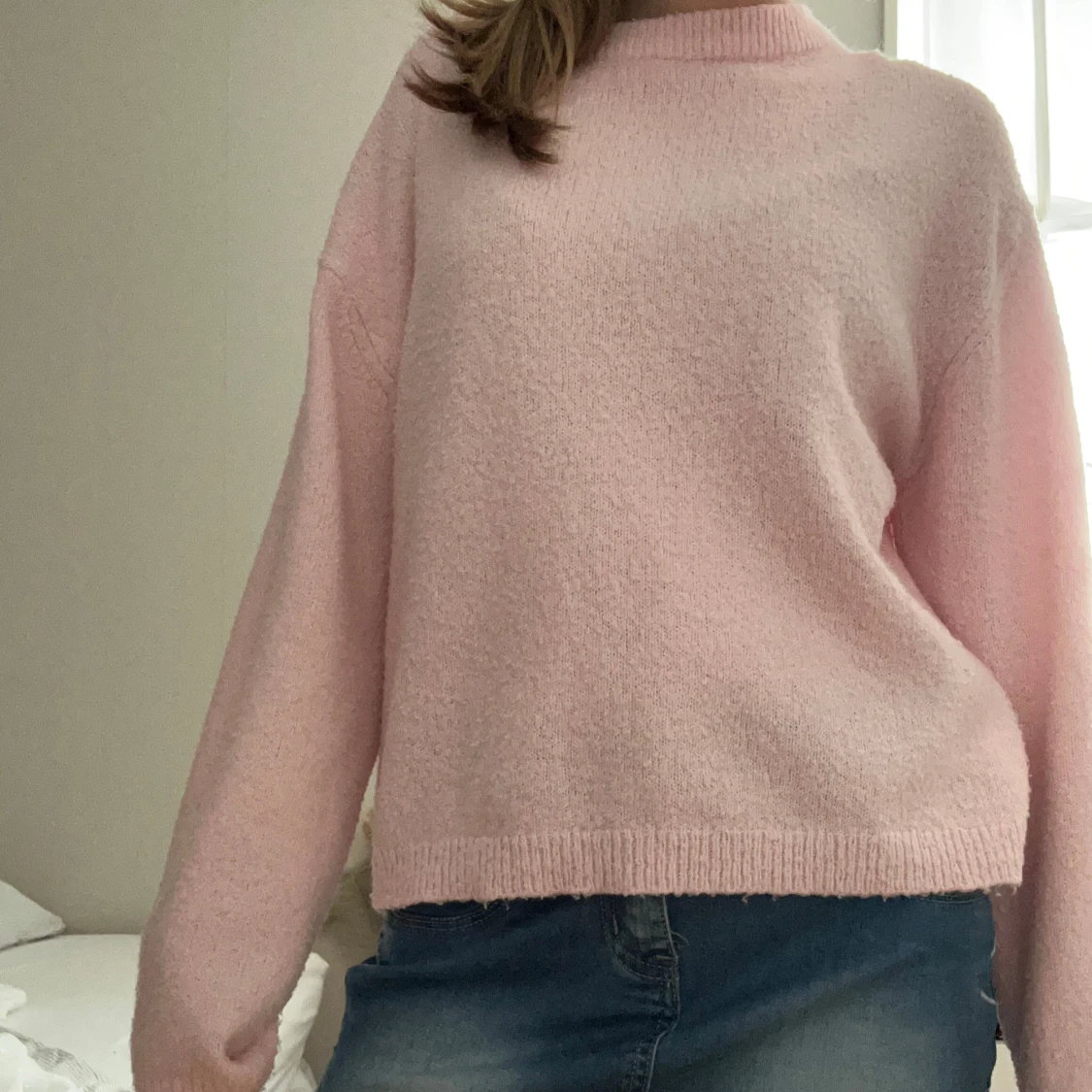 Supermjuk och mysig ljusrosa stickad tröja med avslappnad passform. Tröjan har rund halsringning, långa ärmar och ribbade muddar vid ärmslut och nederkant. Perfekt för lager-på-lager och chill dagar.
