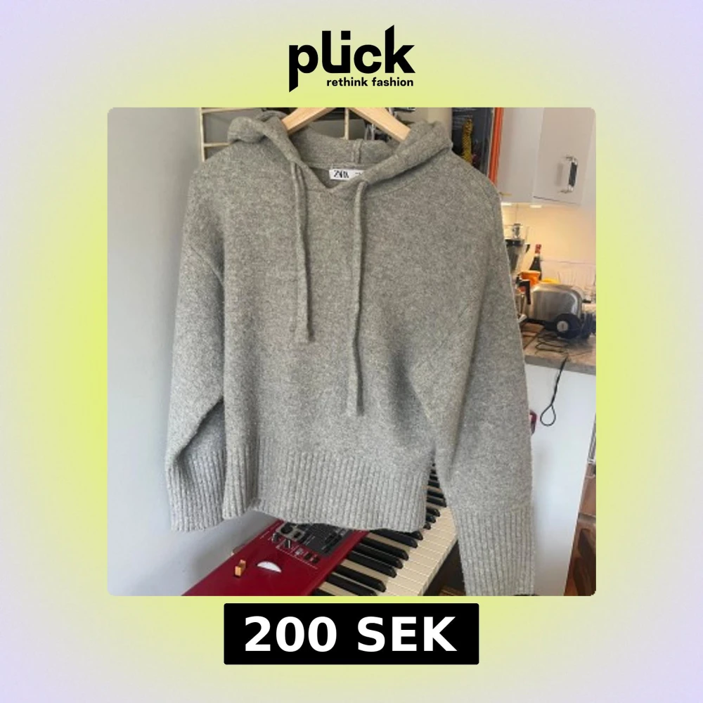 Mysig grå stickad hoodie från Zara med långa ärmar och en bekväm passform. Perfekt för kyliga dagar med sin ribbade nederkant och muddar. Jag har använt den ett få tal gånger men den är i jättefint skick!❤️