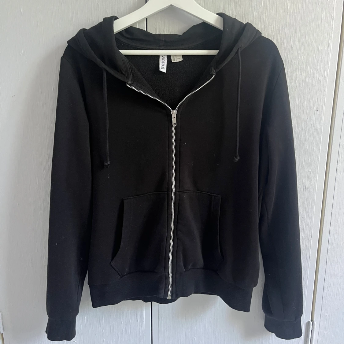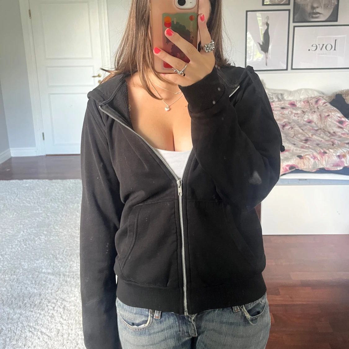Svart huvtröja från H&M Divided med dragkedja framtill, huva med snörning och två fickor. Tröjan är välanvänd men har inga synliga defekter (fläcken är på spegeln). Säljer tröjan pga att den aldrig används längre💕