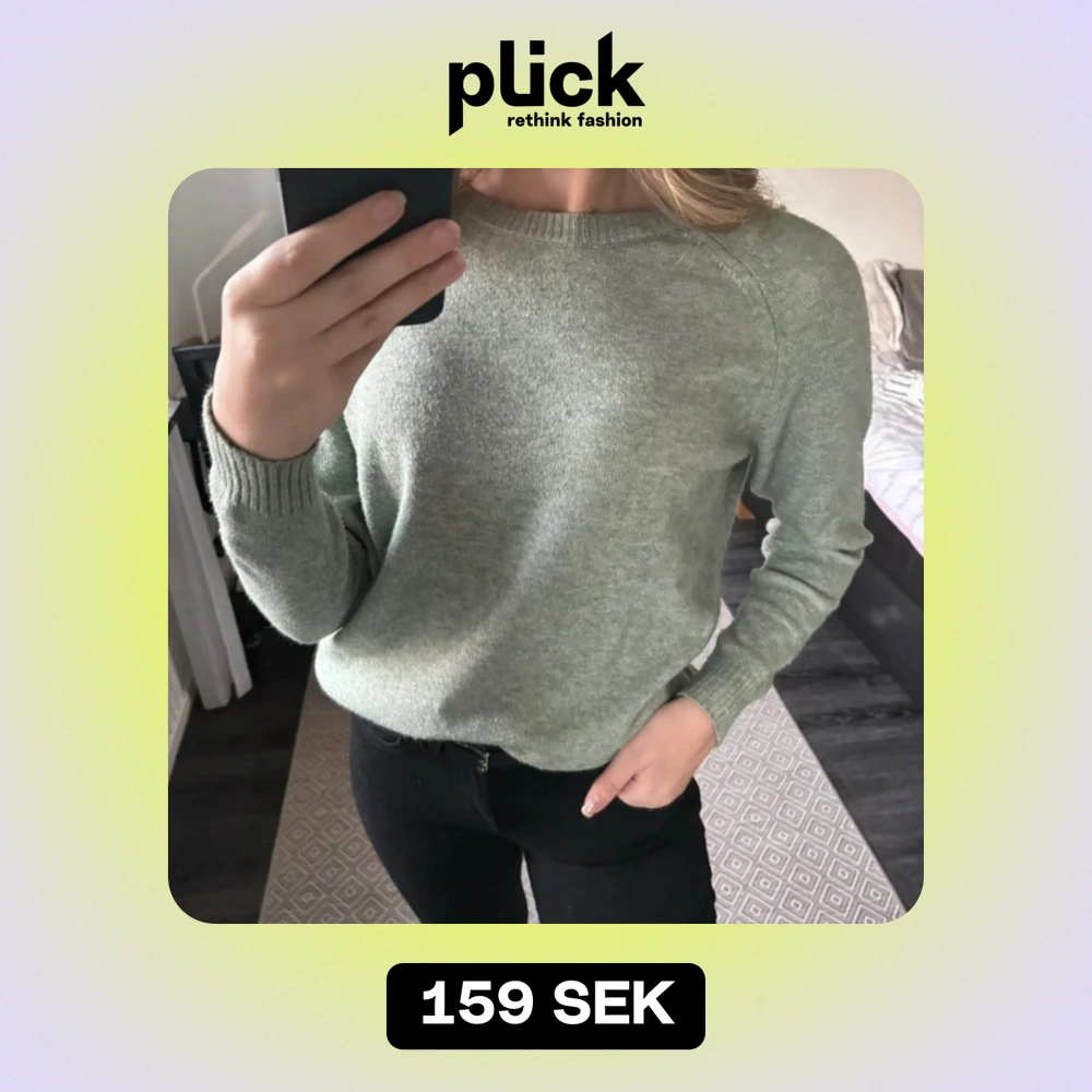 Säljer en supermysig grön stickad tröja i mycket bra skick. Den har en normal passform med långa ärmar och ribbade muddar vid ärmslut och nederkant. Perfekt för höst och vår när du vill hålla dig varm och stilren.