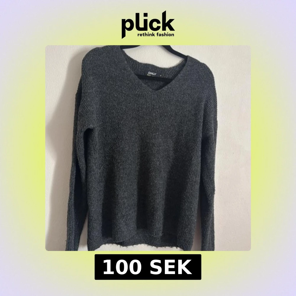 Säljer en mysig grå stickad tröja från ONLY med v-ringning. Perfekt för kyliga dagar och enkel att matcha med olika outfits. Tröjan har långa ärmar och en avslappnad passform.