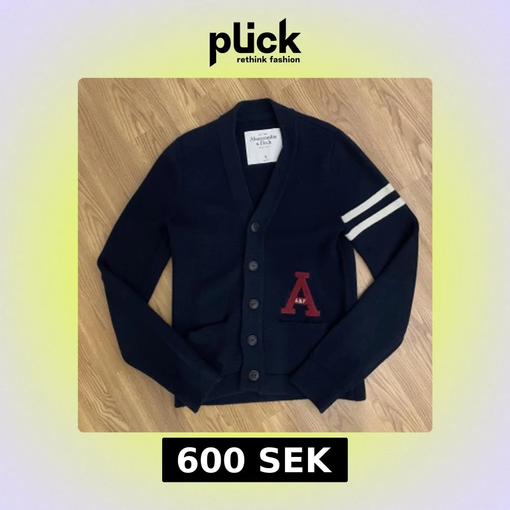 Mörkblå kofta från Abercrombie & Fitch i storlek S med knappar framtill, två fickor och röd A-logga på bröstet. Ärmen har två vita ränder som cool detalj. Koftan är stickad och har en klassisk, lite preppy stil som passar perfekt till jeans. (Modell 176cm, 70kg)