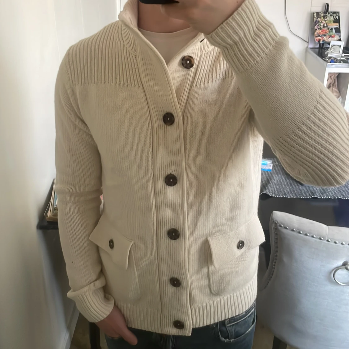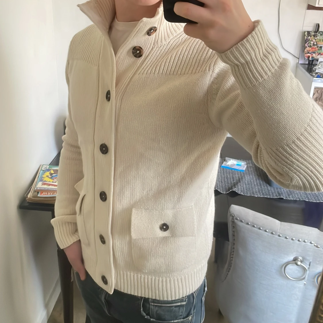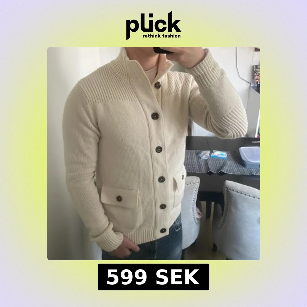 Riktigt fet stickad cardigan i nyskick. Modellen är 72kg och 180cm.