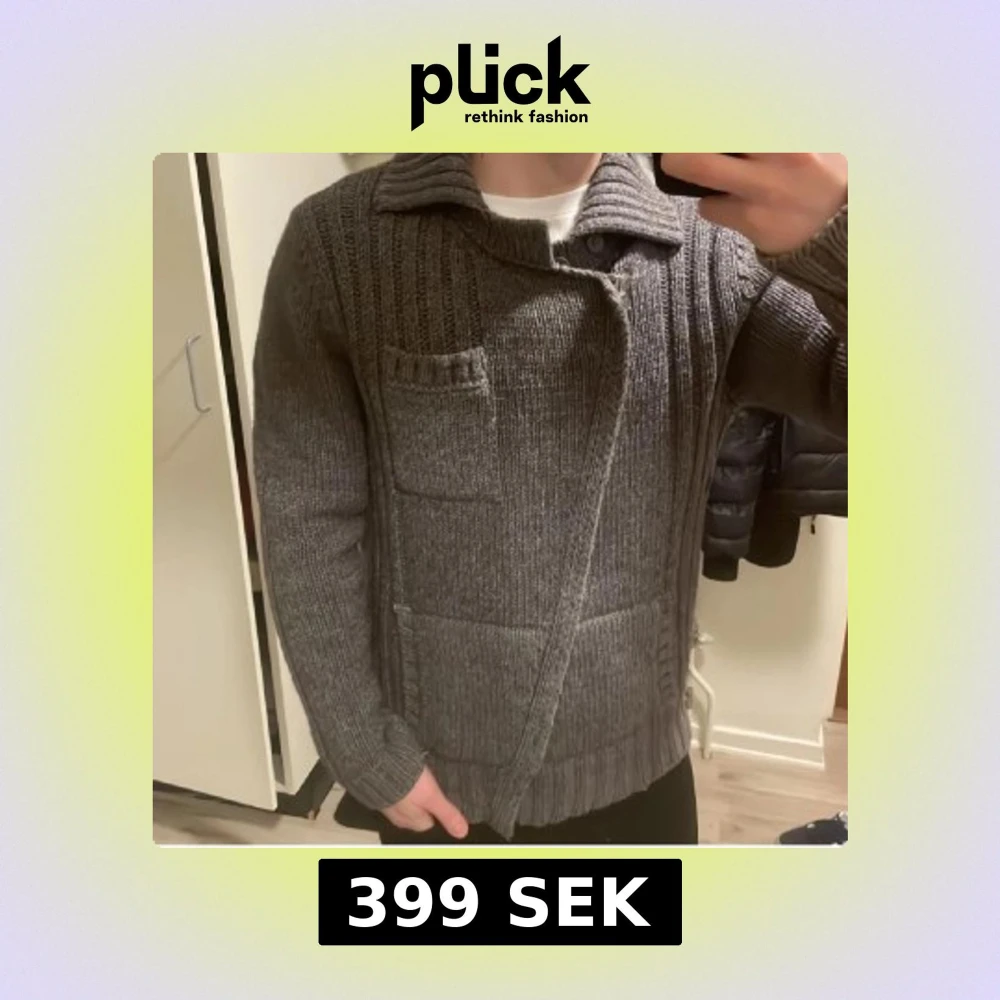 Otroligt fet unik grå stickad cardigan. Modellen är 180cm, 73kg. Storlek L men sitter som M. Priset kan såklart diskuteras!