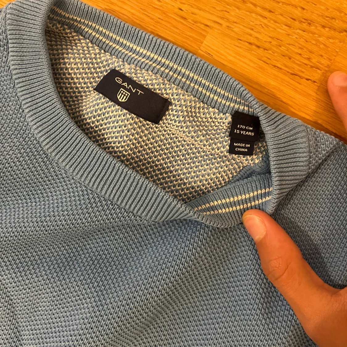 Snygg ljusblå stickad tröja från Gant med rund halsringning och diskret logga broderad på bröstet. Tröjan har ribbade muddar vid ärmslut och nederkant, perfekt för en stilren och avslappnad look.