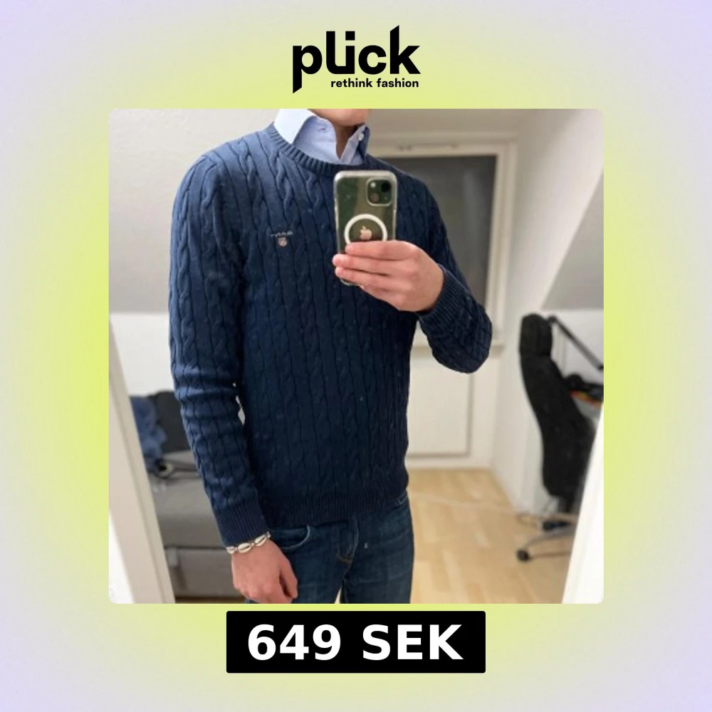Säljer en stilren mörkblå kabelstickad tröja från GANT. Tröjan har en klassisk rund halsringning och ett diskret broderat emblem på bröstet. Perfekt för en elegant och avslappnad look. Jätte bra nu för dem kallare tiderna där man vill klä upp sig lite🤵🏼♂️
