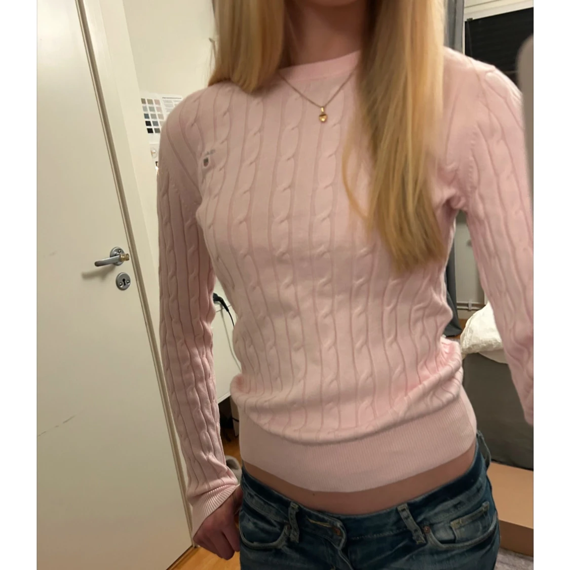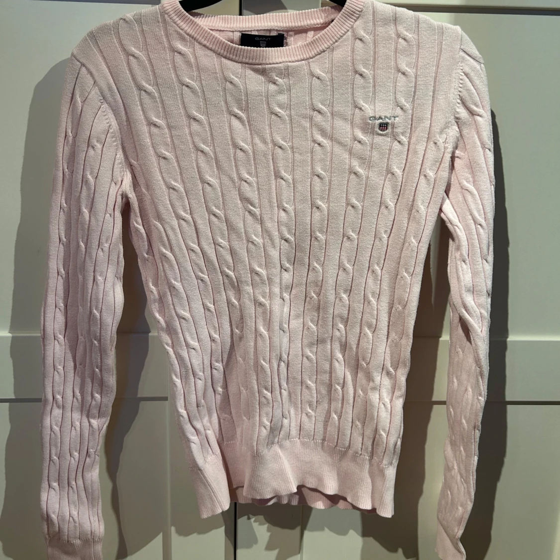 Säljer en ljusrosa stickad tröja från GANT med kabelstickat mönster. Tröjan har långa ärmar och en rund halsringning.🩷