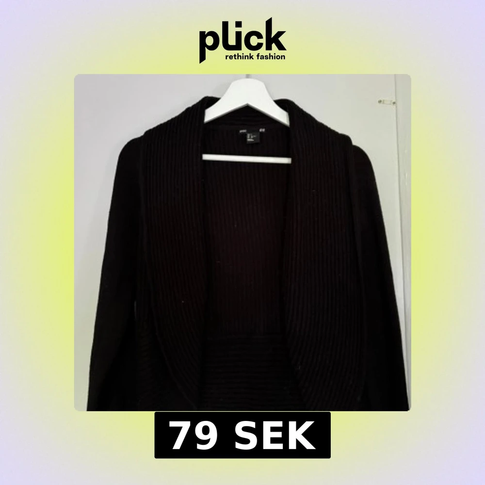 Svart långärmad kofta från H&M med bred ribbad krage och framstycke. Koftan är öppen framtill och har en avslappnad passform.
