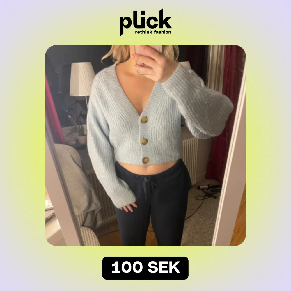 En kort blå stickad kofta med bruna knappar från H&M. Använt ett fåtal gånger så i bra skick.
