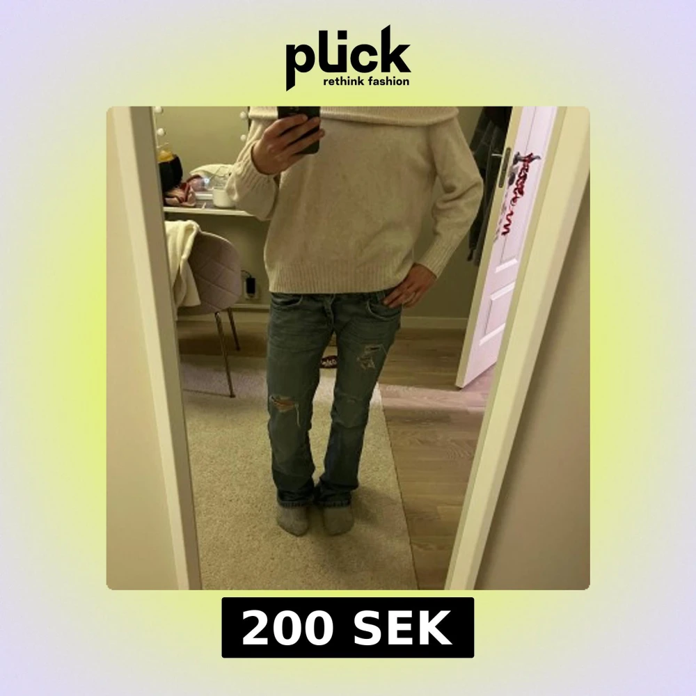 Säljer en mysig ljusbeige offshoulder tröja med ribbade detaljer och den är stickad. Tröjan har långa ärmar och en lös passform.
