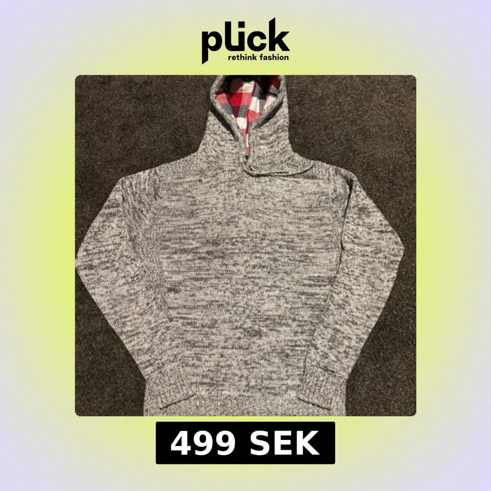 Säljer en riktigt snygg stickad hoodie från House med rutig fodrad huva i rött, vitt och blått. Tröjan har snörning i huvan och långa ärmar. Perfekt för kyliga dagar och riktigt skön att ha på sig.