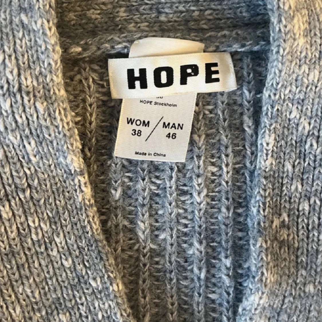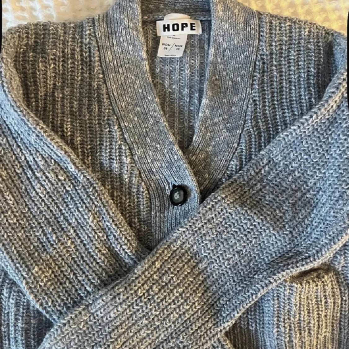 Säljer en ljusgrå stickad kofta från HOPE med stora svarta knappar framtill. Perfekt för lager-på-lager och enkel att matcha med jeans eller kjol.