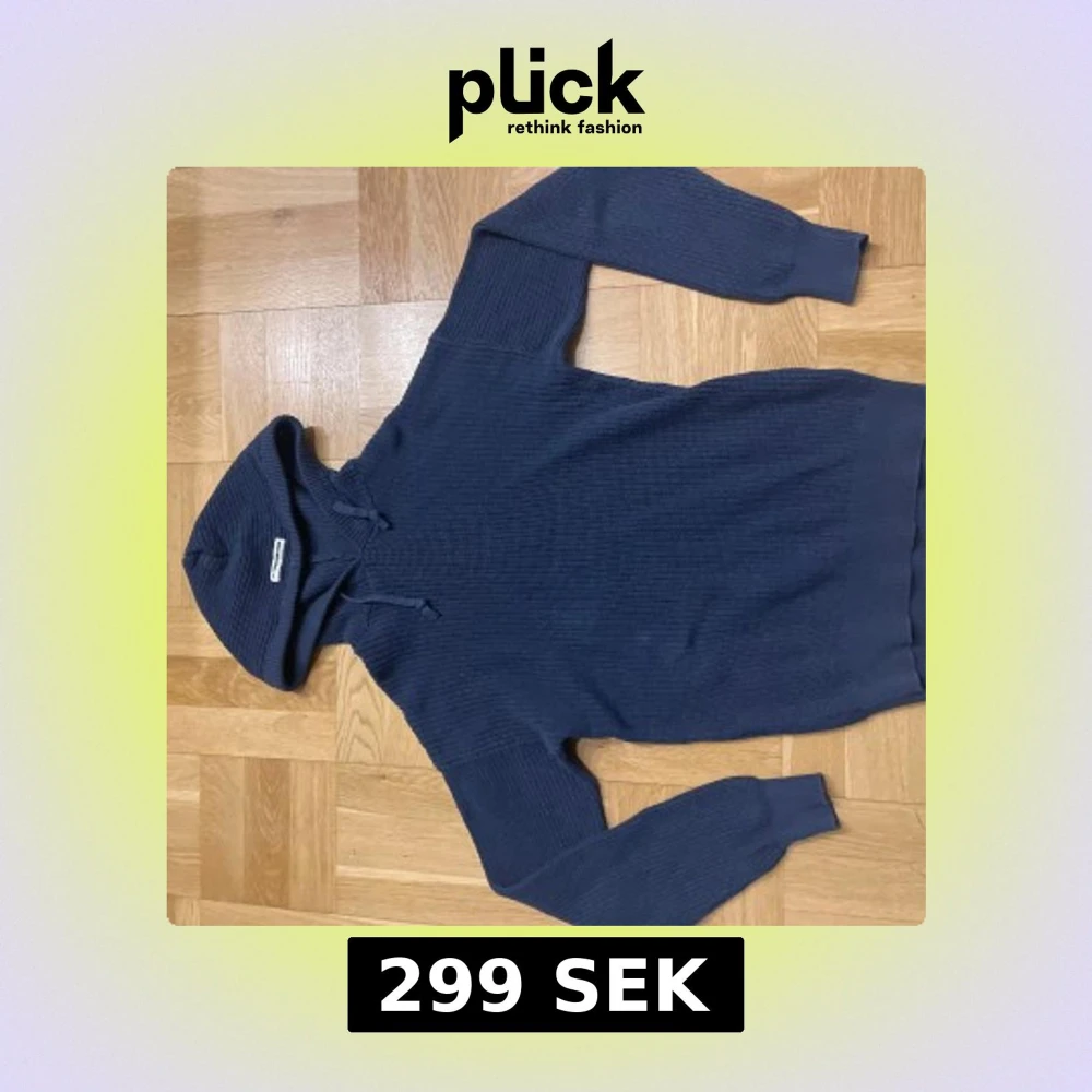 Säljer en snygg mörkblå hoodie från REBEL i storlek S. Den är stickad med en ribbad struktur och har en klassisk huva med dragsko. Perfekt för kyliga dagar!