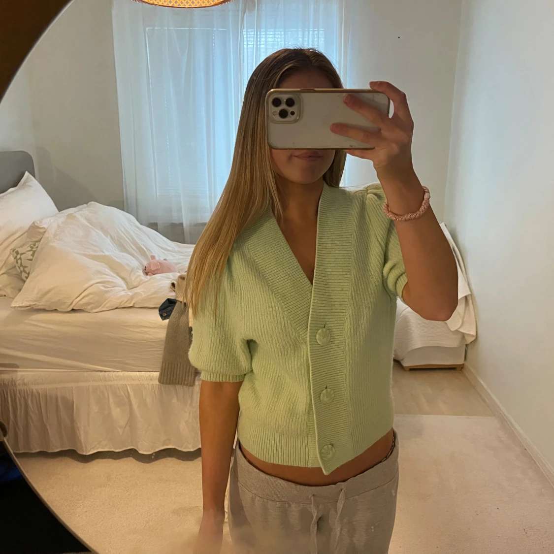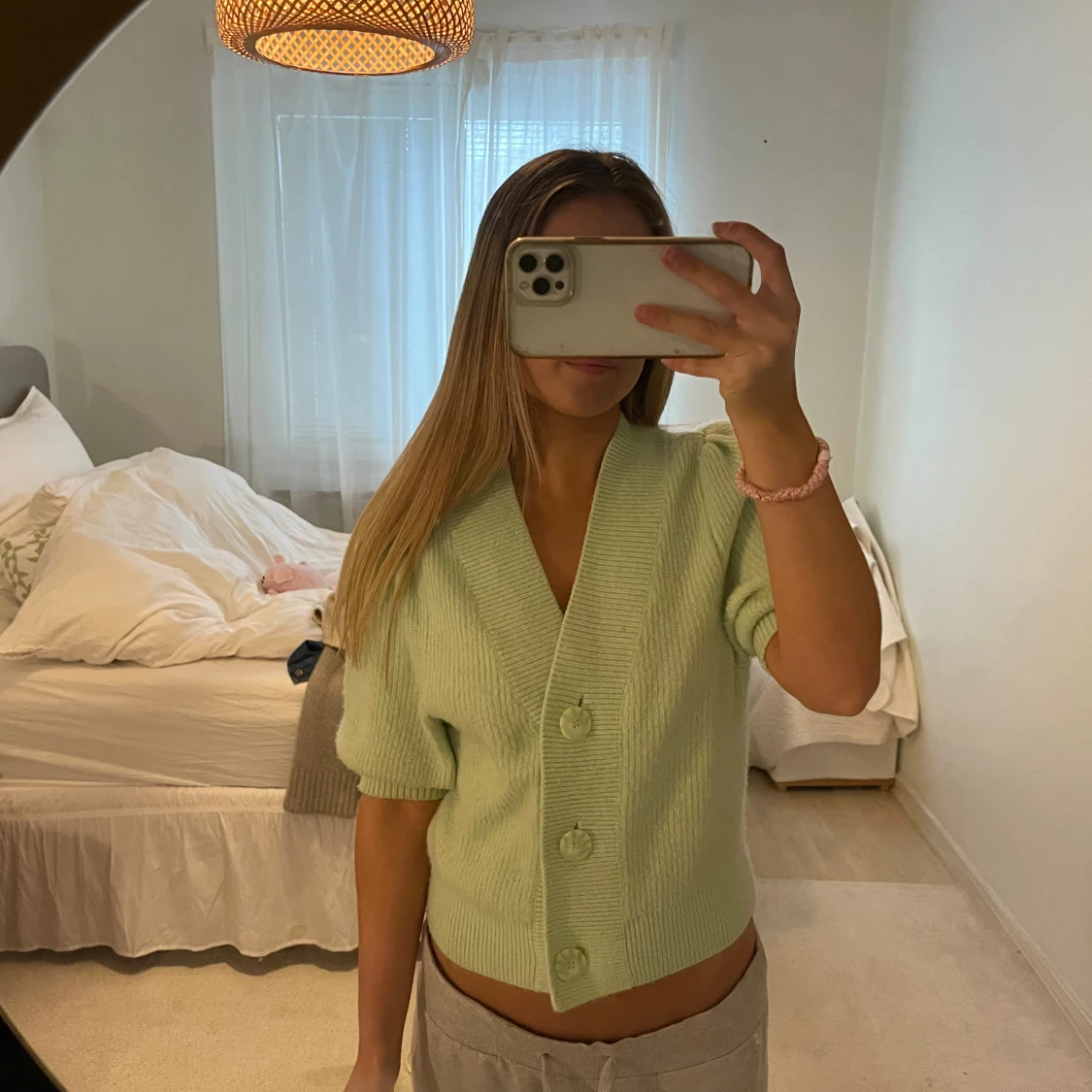Superfin mintgrön stickad kofta med korta ärmar och stora knappar framtill. Koftan har v-ringning och ribbade detaljer längs kanterna.