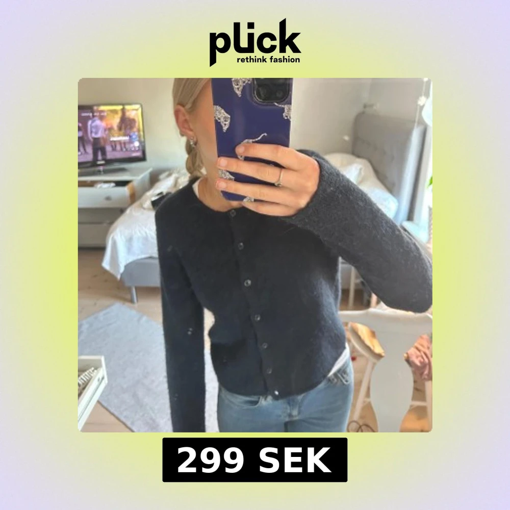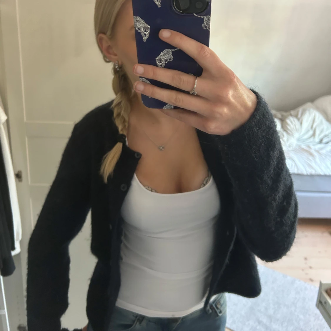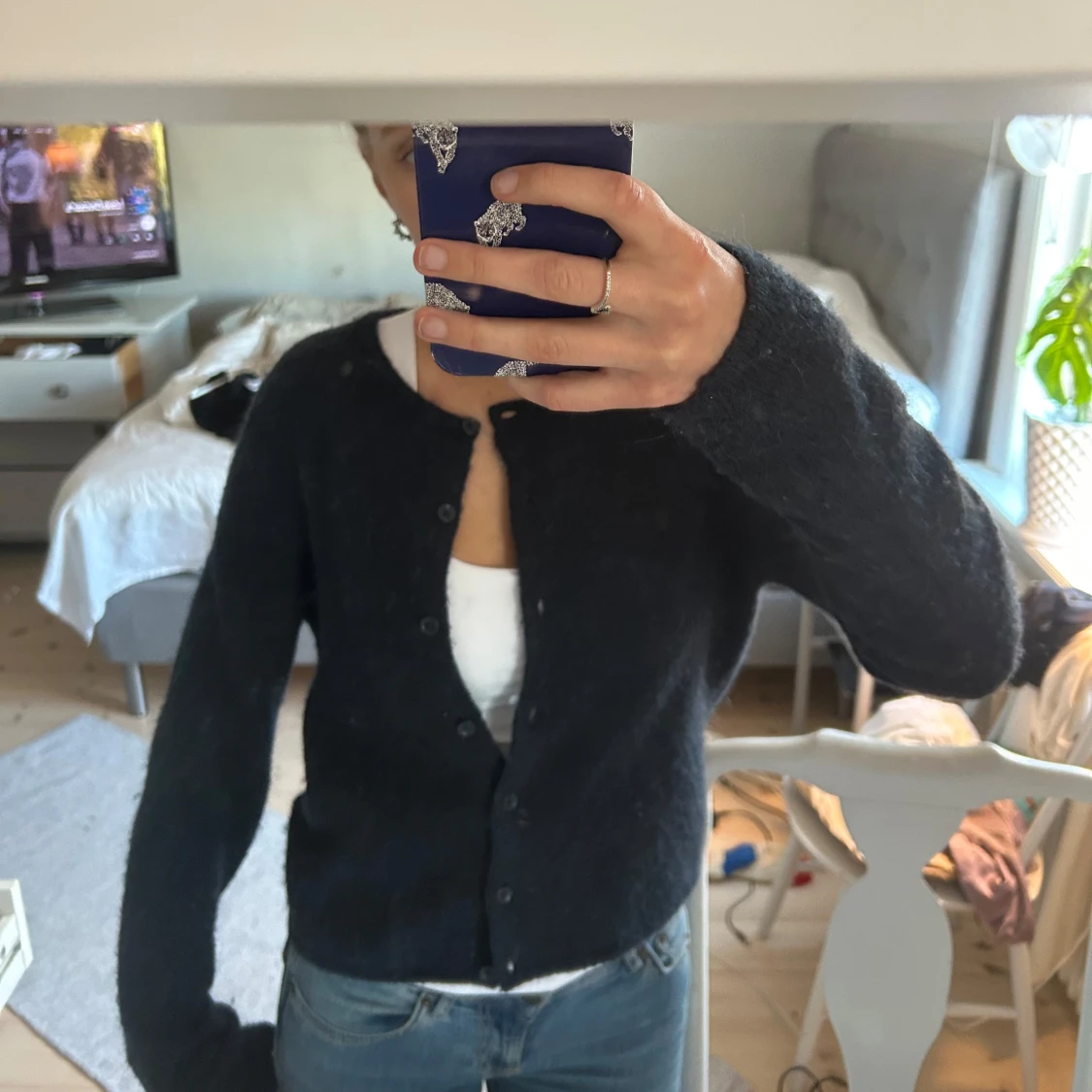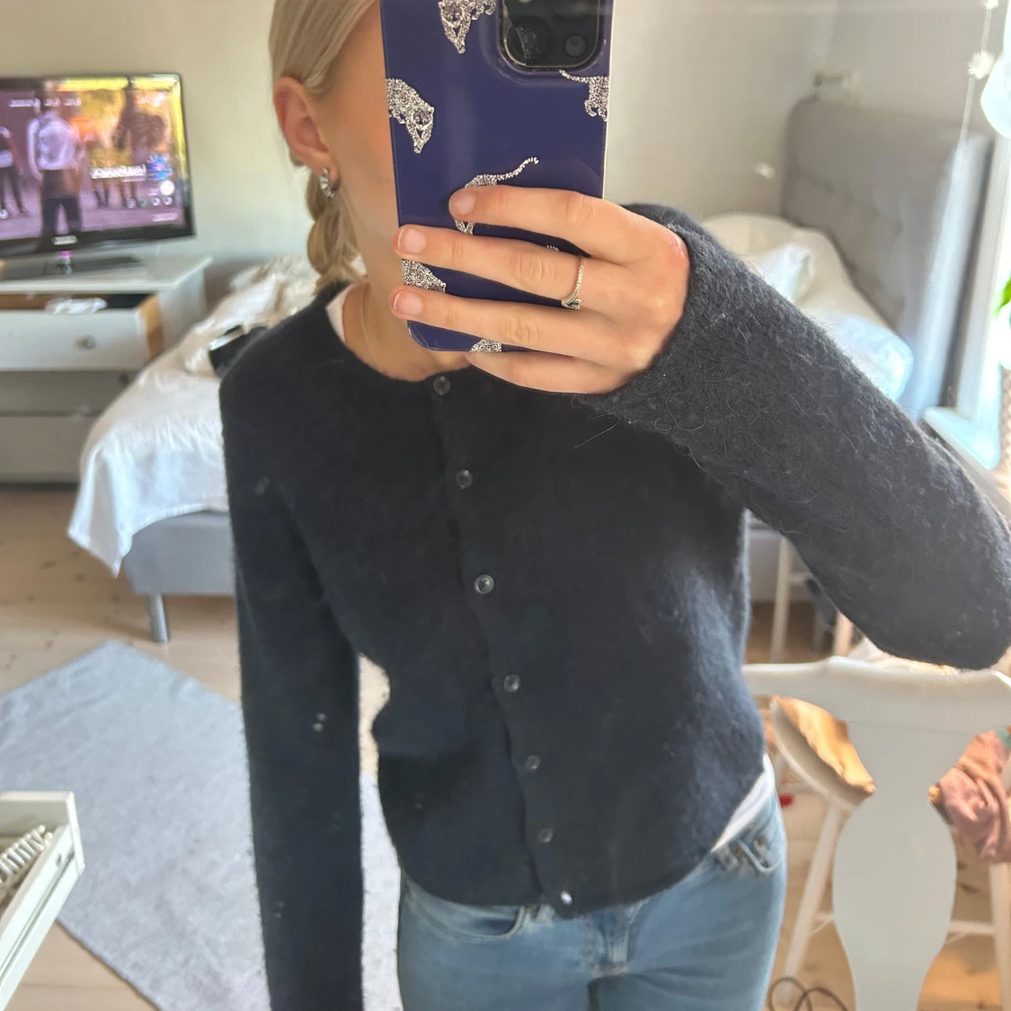 Mörkblå stickad kofta i bra skick, använd få gånger. Perfekt nu i vår över linnen, går även att ha knäppt.skriv för fler frågor💕
