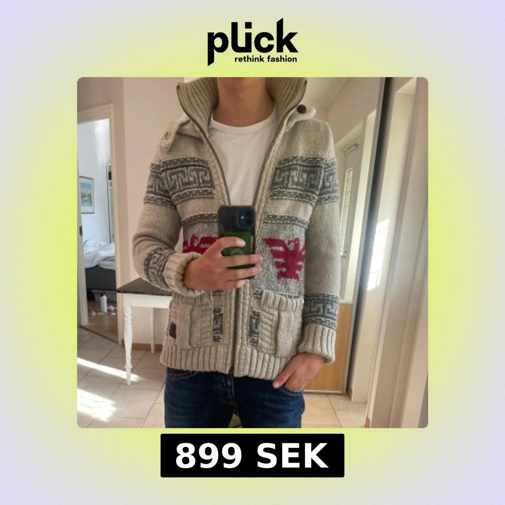 Säljer en stickad cardigan från Superdry i beige och grått med röda mönster av örnar. Koftan har dragkedja, hög krage med knapp och två stora fickor framtill. Tjockt och mysigt material, perfekt för kyliga dagar och tuff archive stil