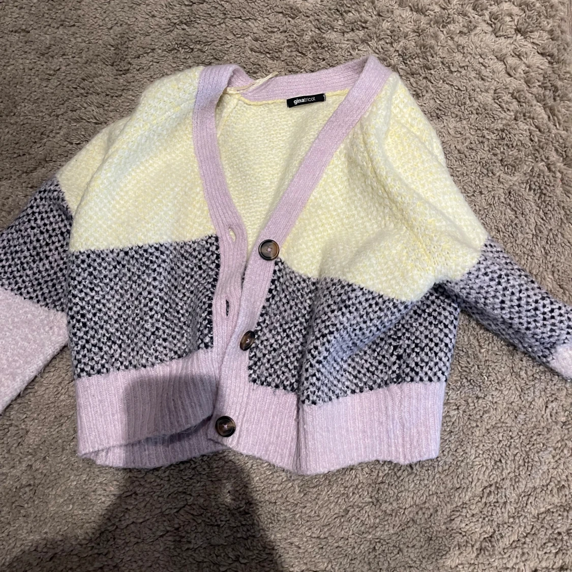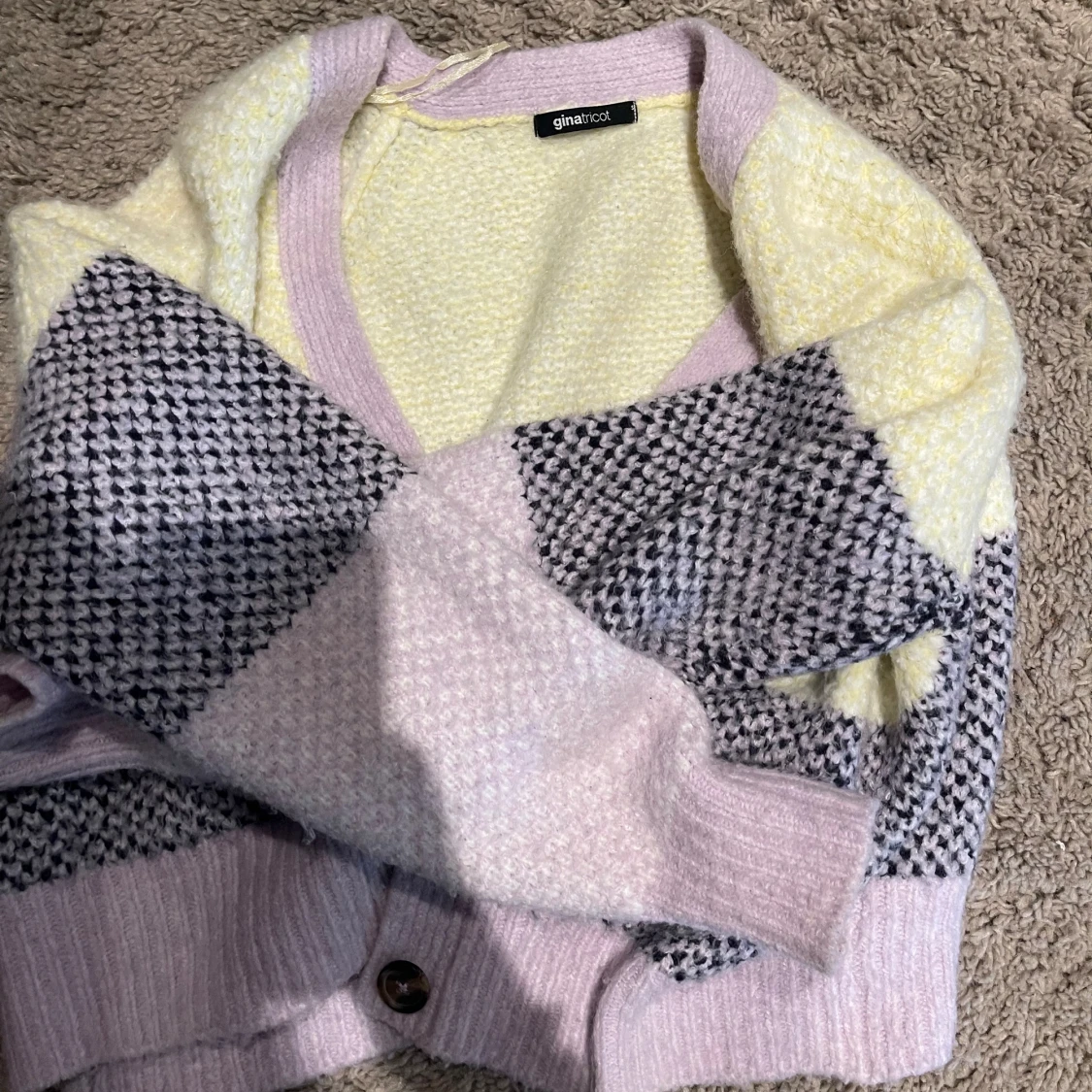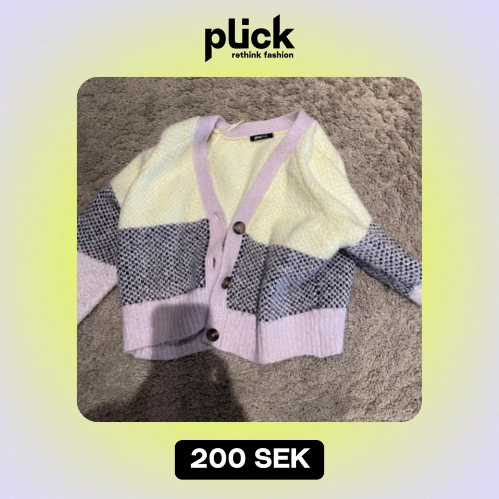 Den är i storleken S fast man kan bära den också om man har i storleken M. Den är stickad och varm material. Tre olika färger gul,lila och en som är väldigt coolt färg svart och lila. Använt den 3 gånger
