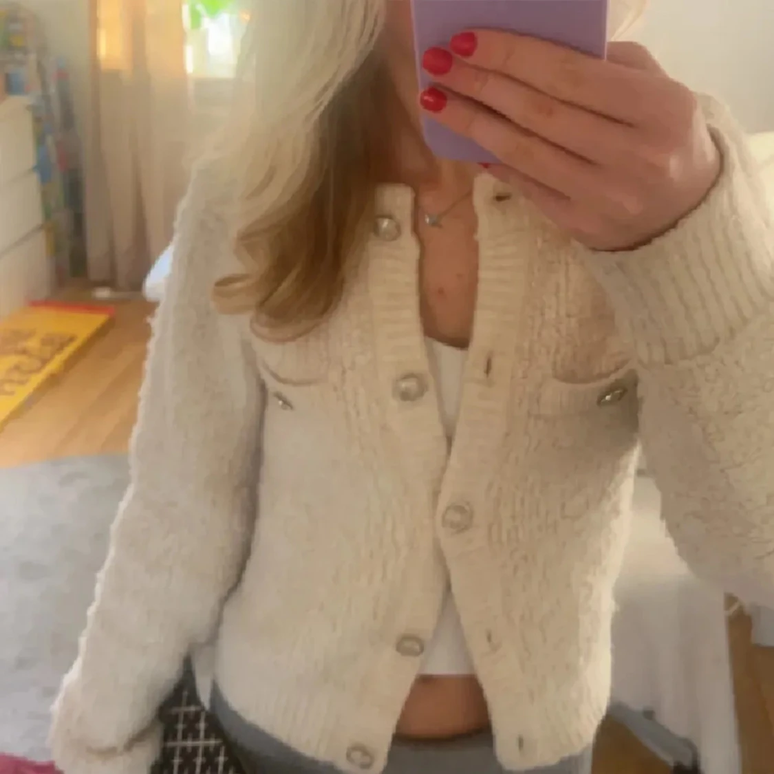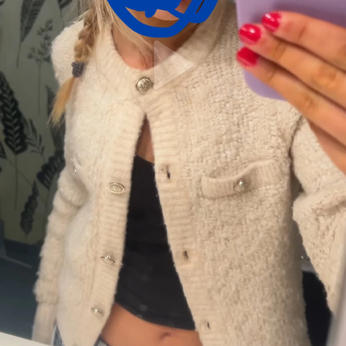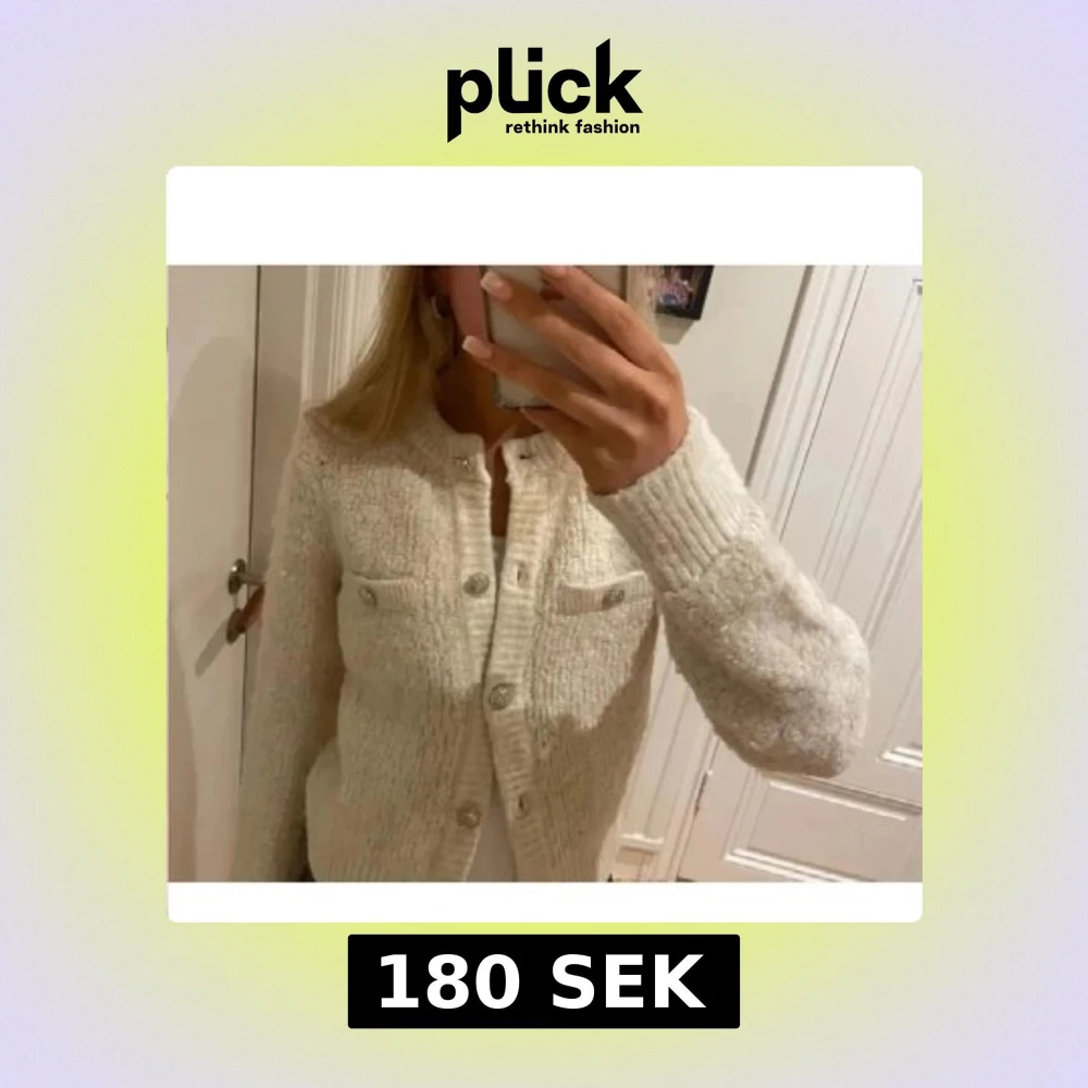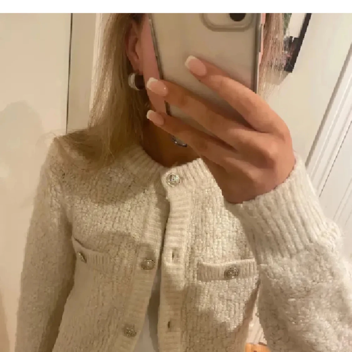 Supermysig beige stickad kofta med glittriga knappar och två fejkade bröstfickor. Koftan har rund halsringning, ribbade muddar och lång ärm. Perfekt att slänga över en topp för en chill och snygg look.