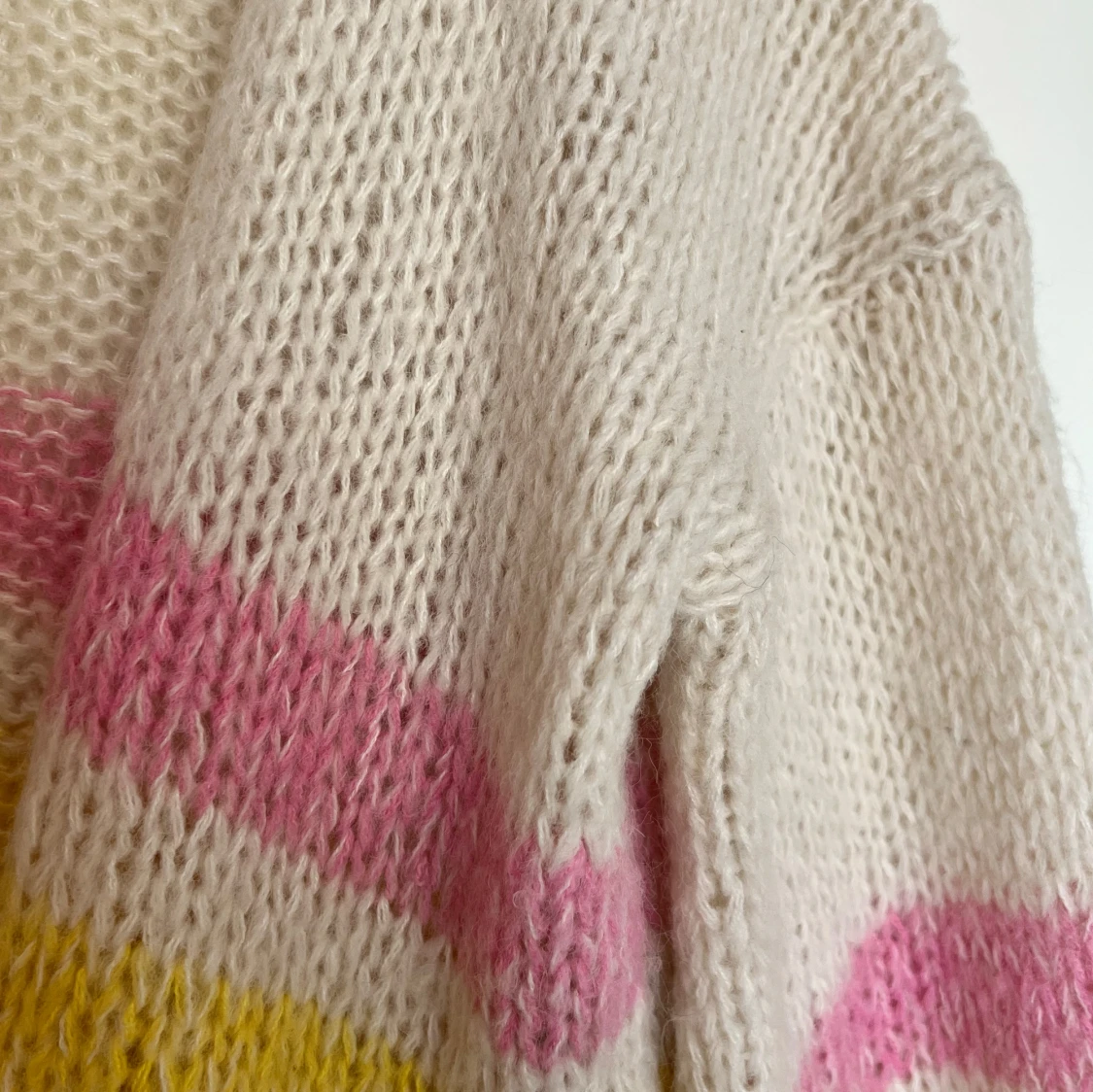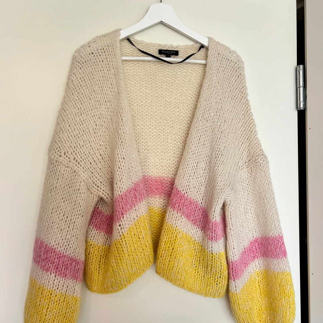 Intressekoll på min supermjuk och oversized stickad kofta från selected i vit beige med rosa och gult. Koftan har långa ärmar och en öppen front utan knappar. Perfekt för både sommar och vinter en färgglad touch till outfiten.💗