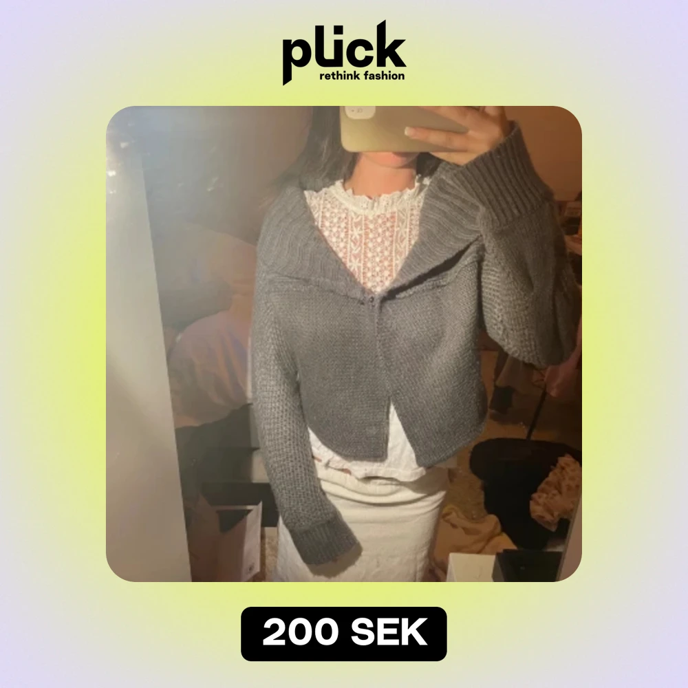 supersnygg grå stickad kofta med krage! så fina detaljer där bak. står M men passar även mig med xs/s, klicka gärna på ’köp nu’ 🤗