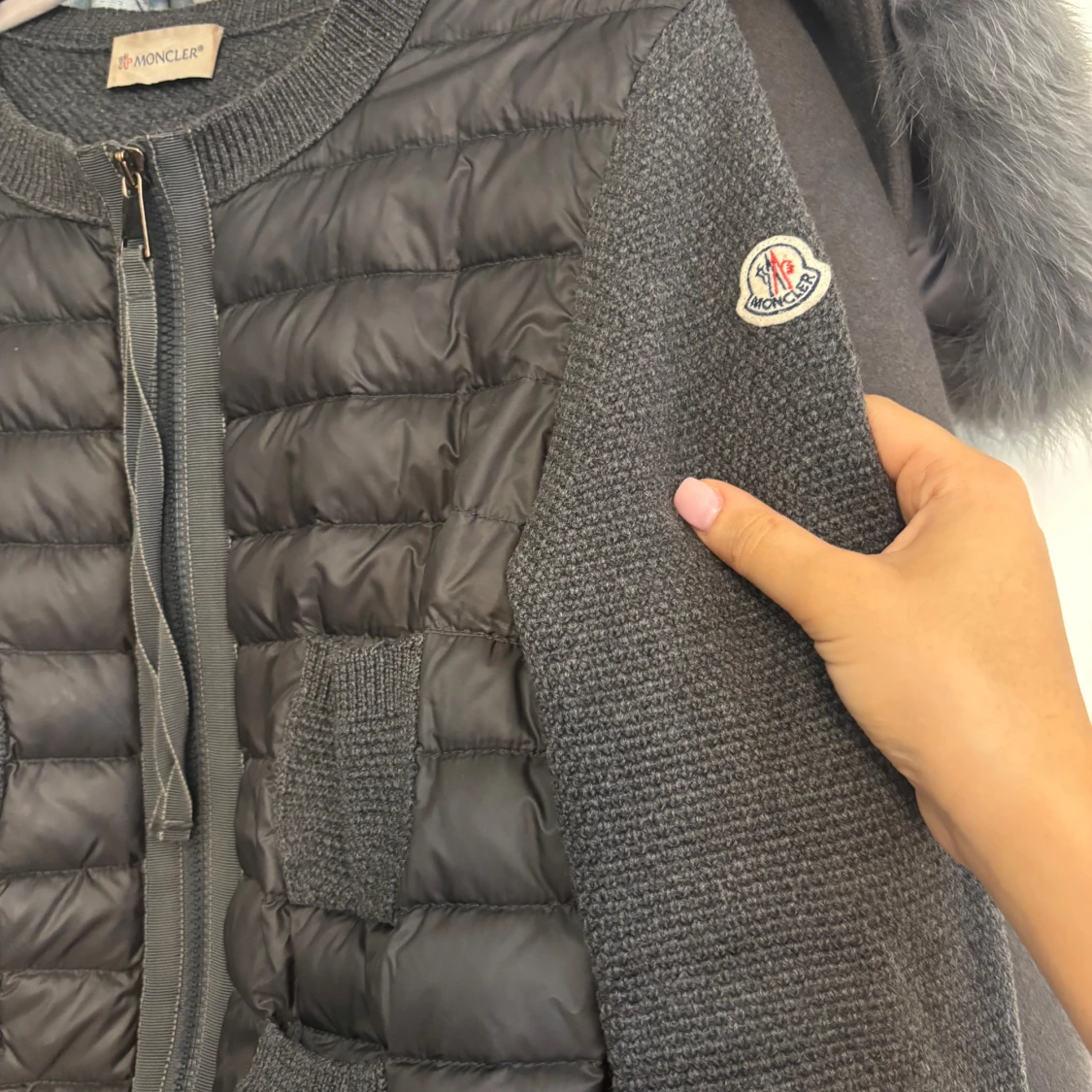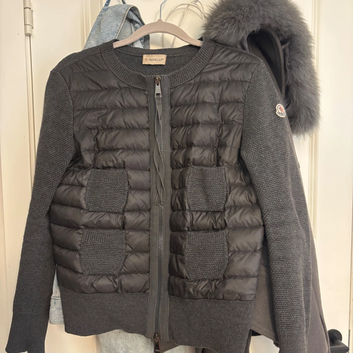 Säljer härmed min ur snygga Moncler cardigan med quiltad front och stickade ärmar. Två stickade fickor framtill och dragkedja hela vägen. Klassisk Moncler-logga på ärmen. Perfekt för lager-på-lager under höst och vinter. ÄKTA