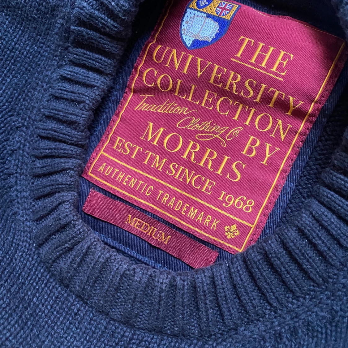 Hej! Säljer en väldigt snygg mörkblå stickad tröja från Morris. Tröjan har en patch på vardera armbåge och är i storlek M. Längden är 62 cm, armhåla till armhåla är tröjan 48 cm när tröjan ligger platt. Tröjan har även en snygg union jack flagga på framsidan och passar perfekt nu när vädret börjar bli kyligare. Hör av dig vid frågor eller funderingar!