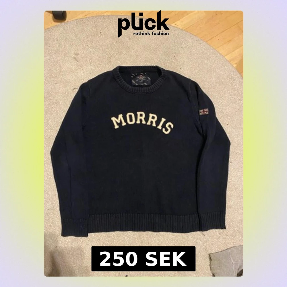 Snygg mörkblå stickad tröja från Morris i storlek Small. Tröjan har vit broderad MORRIS-text på bröstet och en patch med brittiska flaggan på ärmen. Rund hals och ribbade muddar vid ärmslut och nederkant. Perfekt för dig som gillar klassisk stil.