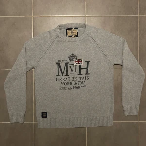 Säljer en stilren grå tröja från Morris med tryck på framsidan som inkluderar en Union Jack-flagga och texten 'Great Britain'. Tröjan har långa ärmar och ribbade muddar vid ärmslut och nederkant. Perfekt för en avslappnad stil.