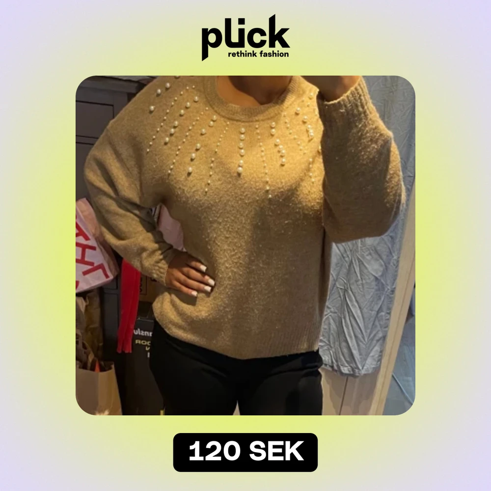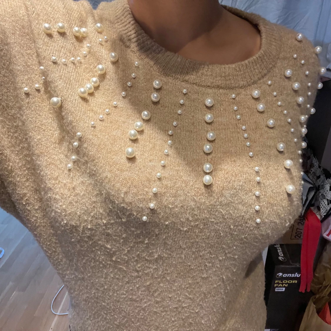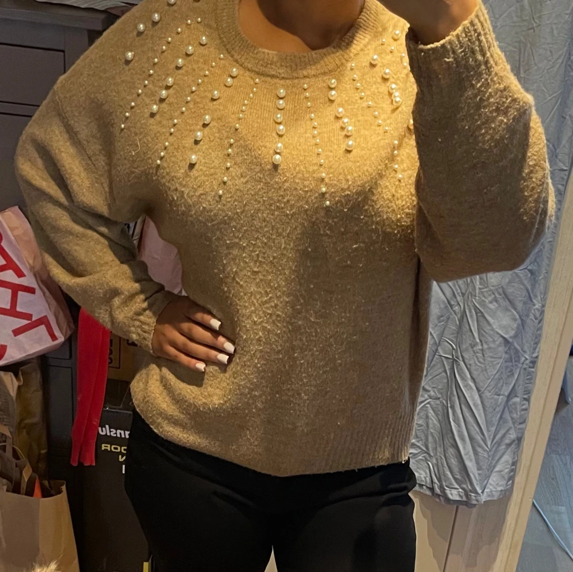 *Brun stickad tröja med vita pärlor *storlek L *inga skador eller missfärgningar