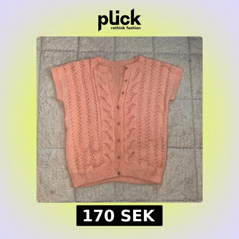Superfin stickad kofta i persikofärg med korta ärmar och snyggt hålmönster. Koftan har rund halsringning och knäpps framtill med små knappar. Perfekt för lager-på-lager och ger en söt vintagekänsla till din outfit.