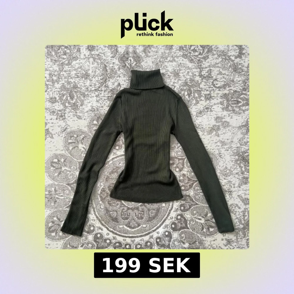 Säljer en mörkgrön ribbad polotröja med lång ärm och hög krage. Tröjan är figurnära och har en snygg, stretchig passform. Perfekt att styla med jeans eller kjol för en höstig look