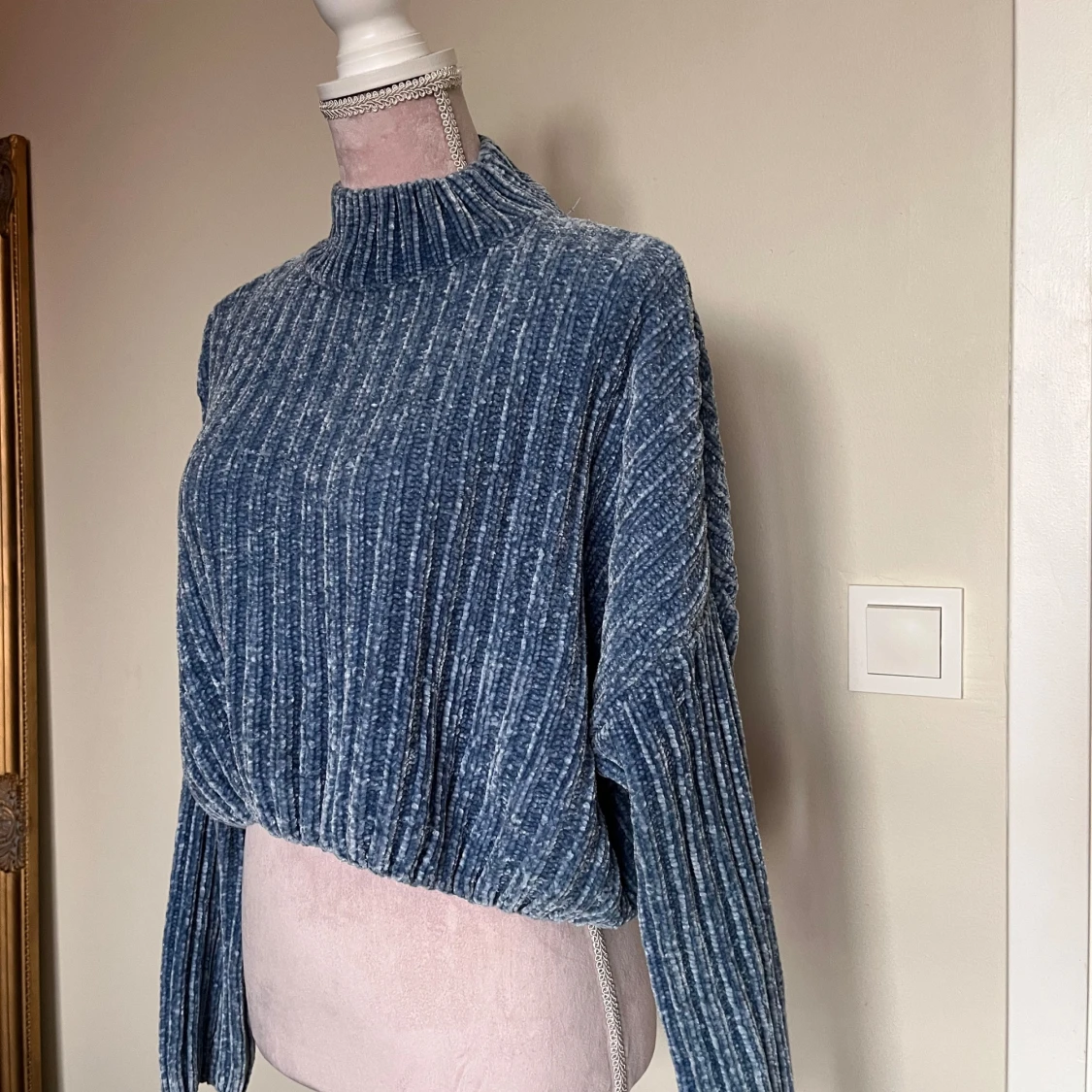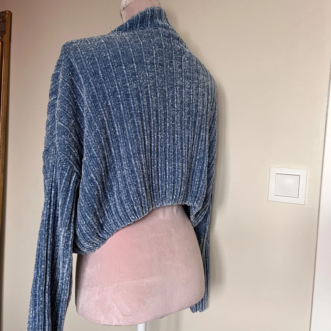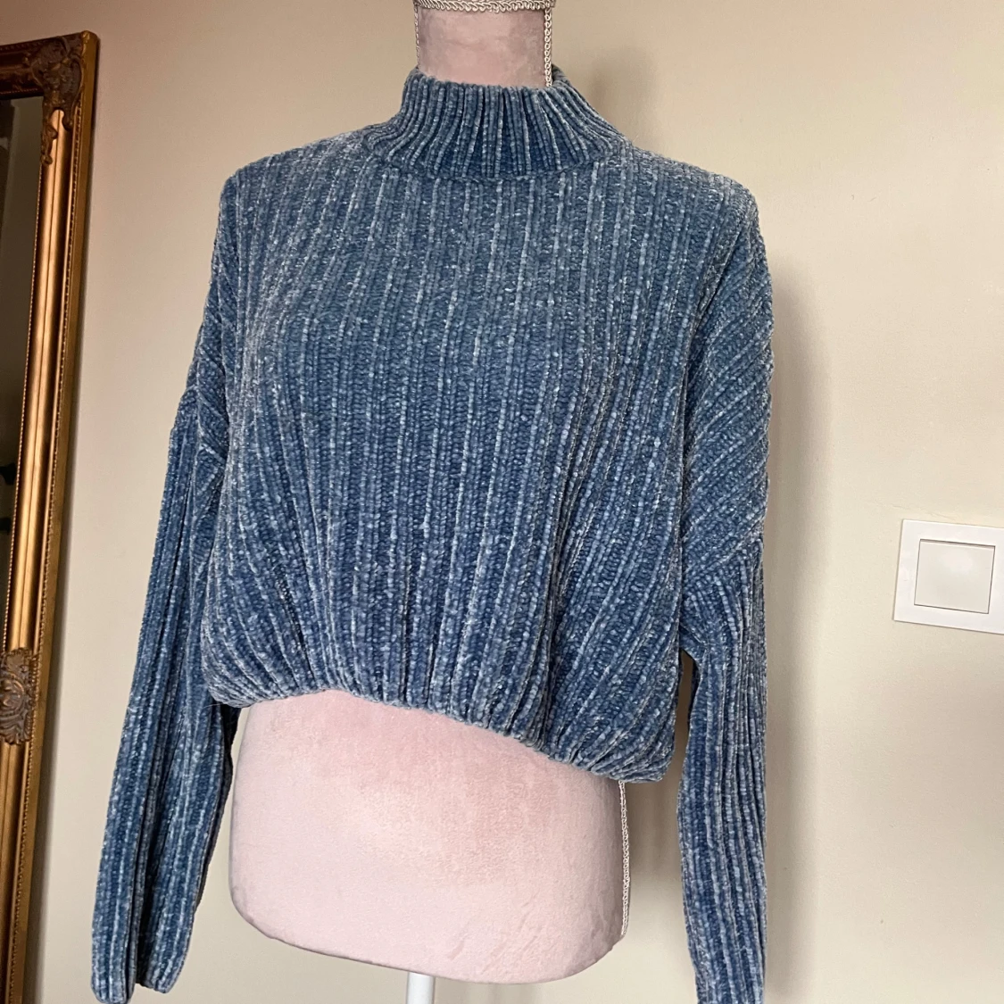 Säljer en supermysig blå oversize stickad tröja med ribbad struktur. Den har en croppad passform och långa ”bat wing” ärmar med hög krage, perfekt för kyliga dagar. Ett måste i garderoben för höst och vinter! Tyget är supermjukt och gosigt i en ljusblå färg som skimmrar vackert i solljuset 😊Super oversized o mycket stretch så passar nog allt från S-XL men har oversize fit för S-M! obs: katt finns i hemmet.
