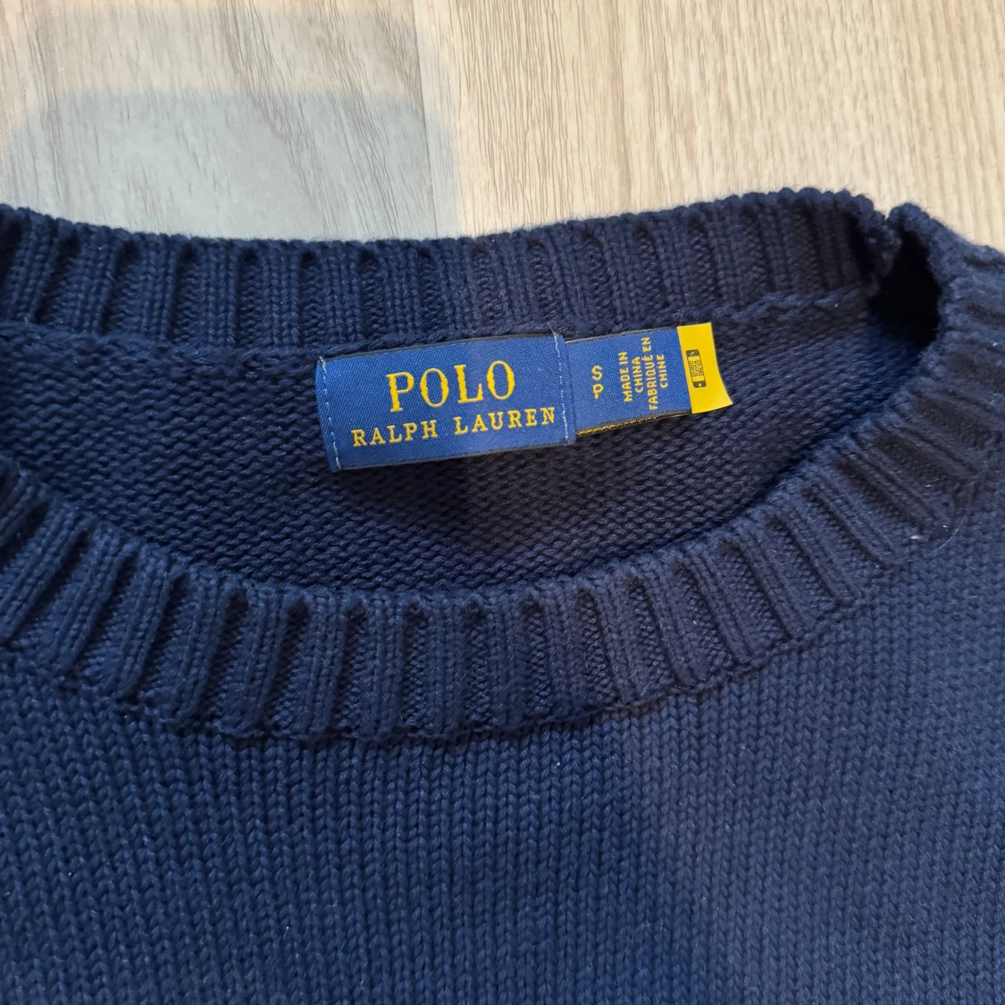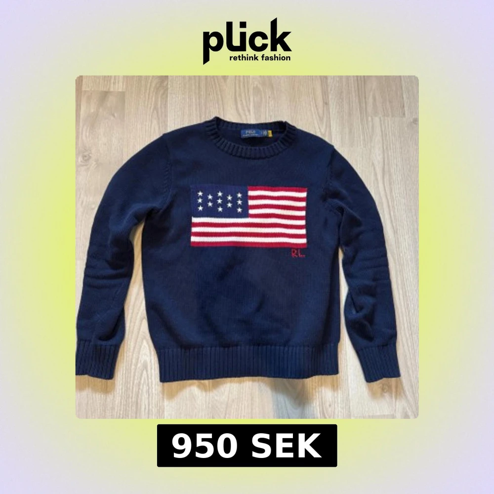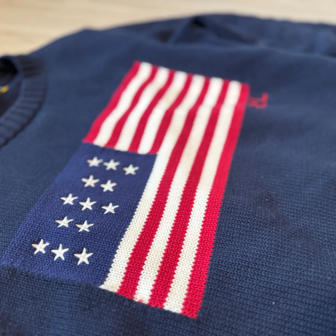 Mörkblå stickad tröja från Polo Ralph Lauren med amerikansk flagga i rött, vitt och blått på bröstet. Klassisk rund halsringning och ribbade muddar. RL-broderi i rött vid flaggan. Perfekt för dig som gillar preppy stil.
