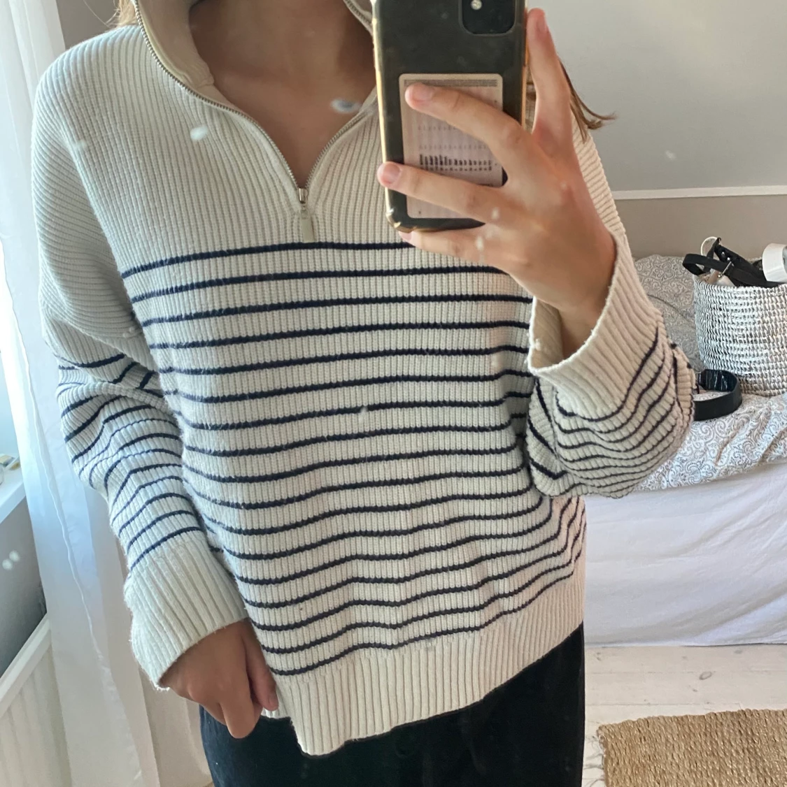 Säljer en randig zip tröja från mango. Helt slutsåld och i väldigt fint skick. Den passar mig som brukar har s-m💕 köparen står för frakt