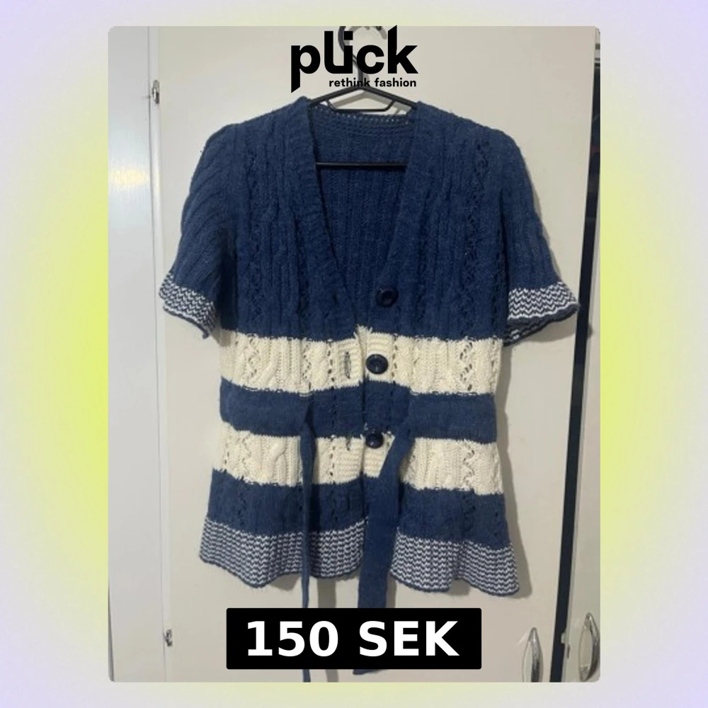 Kortärmad stickad kofta i blått och vitt med breda ränder, v-ringning och 4 stora knappar framtill. Koftan har ett matchande midjeband och strukturstickat mönster. Det går att dra ihop den för en tajtare look men det går lika bra att ha den lös.