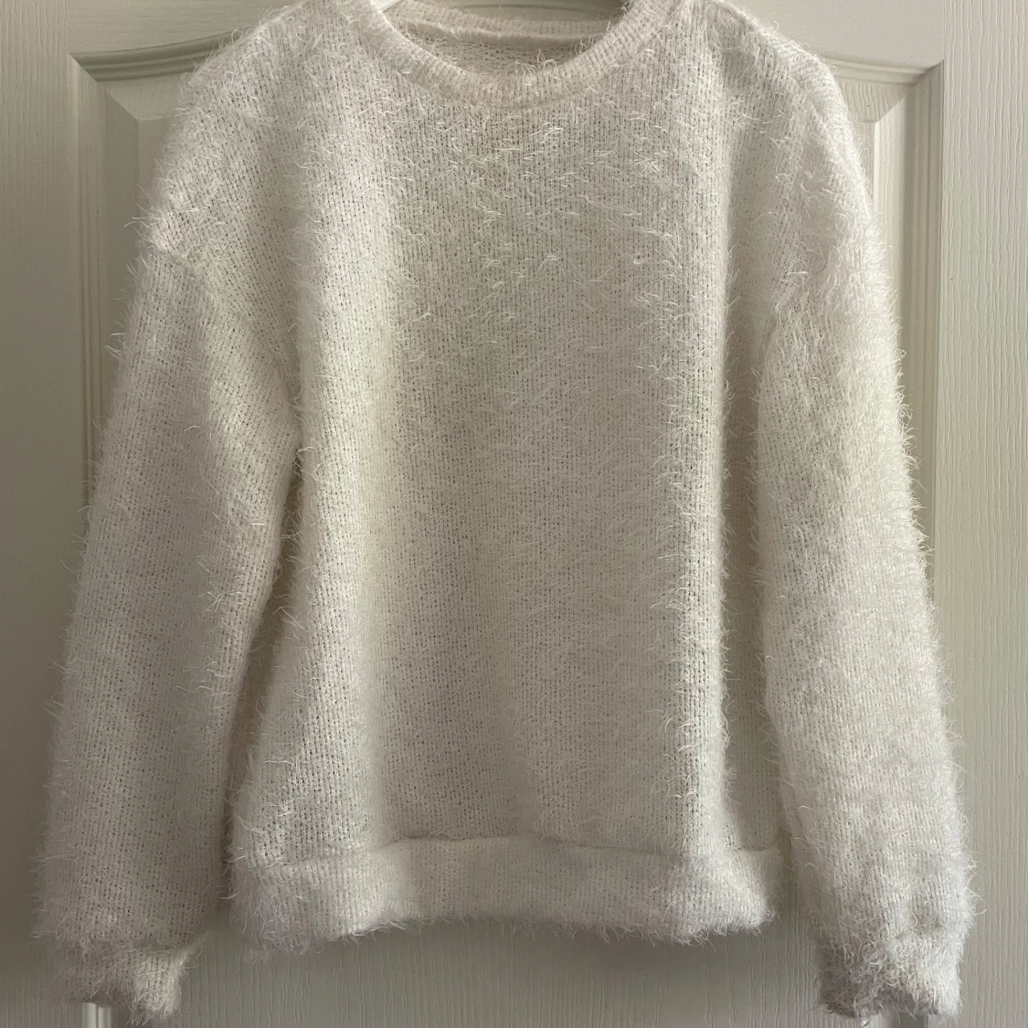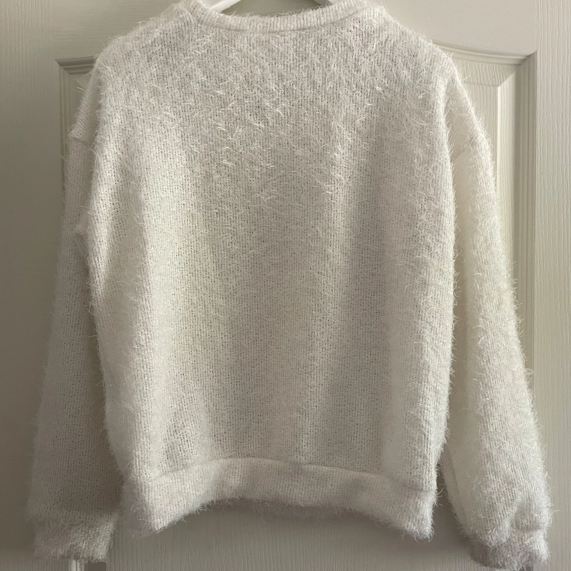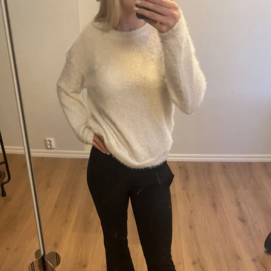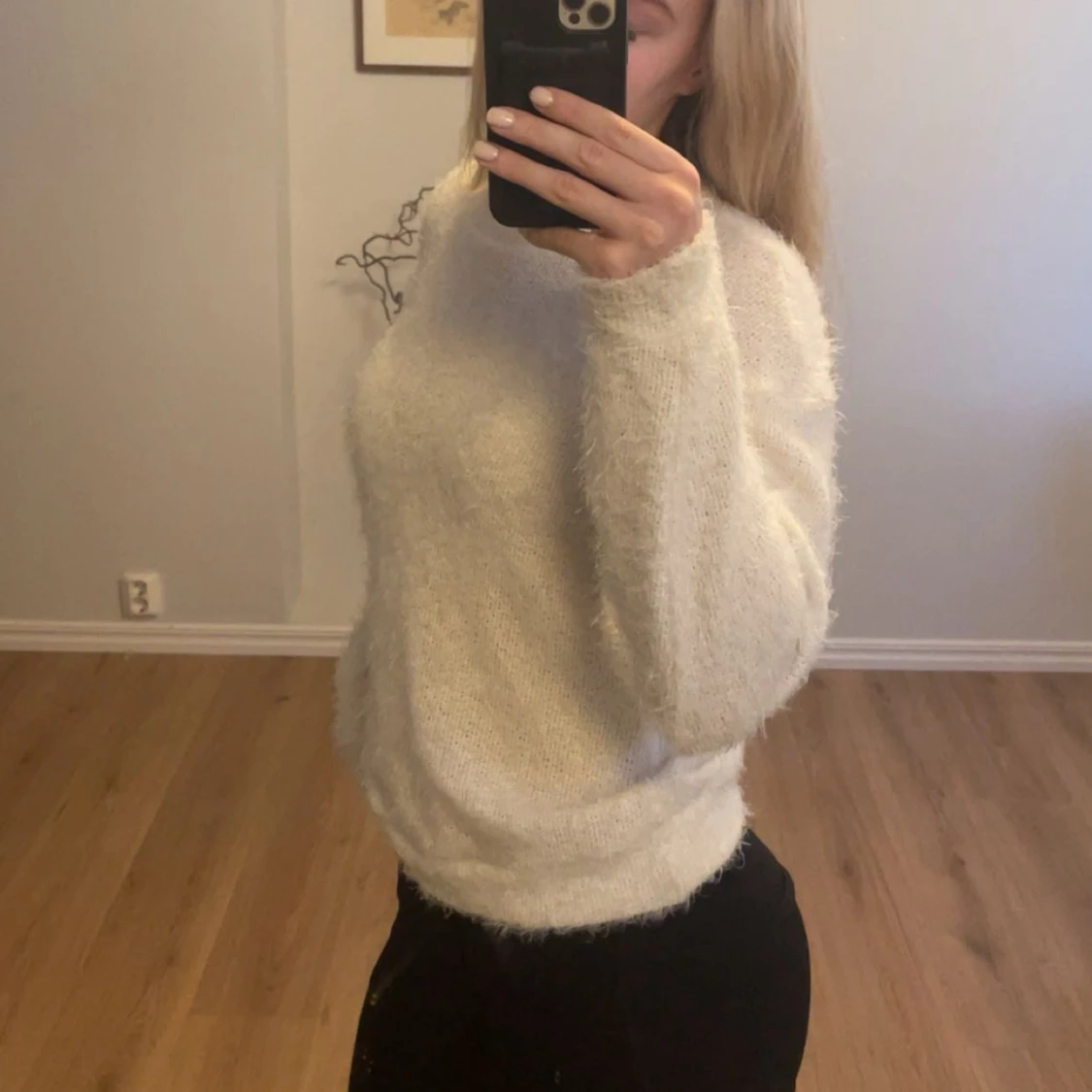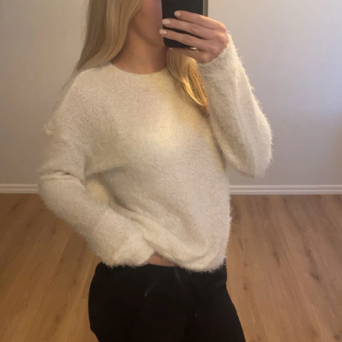 Mysig vit stickad tröja. Lite svalare material, perfekt till sommarkvällar, säljer för att den inte kommer till användning. Inga defekter förutom att lappen är borta💗