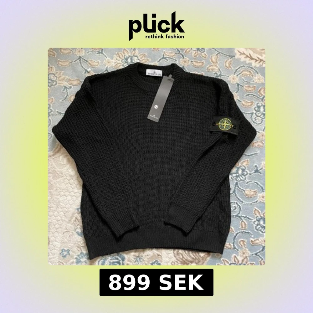 Svart stickad tröja från Stone Island med klassisk kompass-logga på vänster ärm. Tröjan är ny med tagg kvar och har en grovstickad struktur med ribbade muddar.