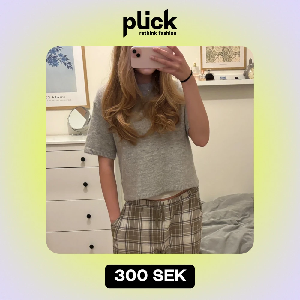 Säljer en superfin grå stickad tröja från Gina Tricot i storlek M. Den är kortärmad och har en mysig, ribbad kant vid ärmslut och nederkant. Perfekt för både vår och höst! 🩶