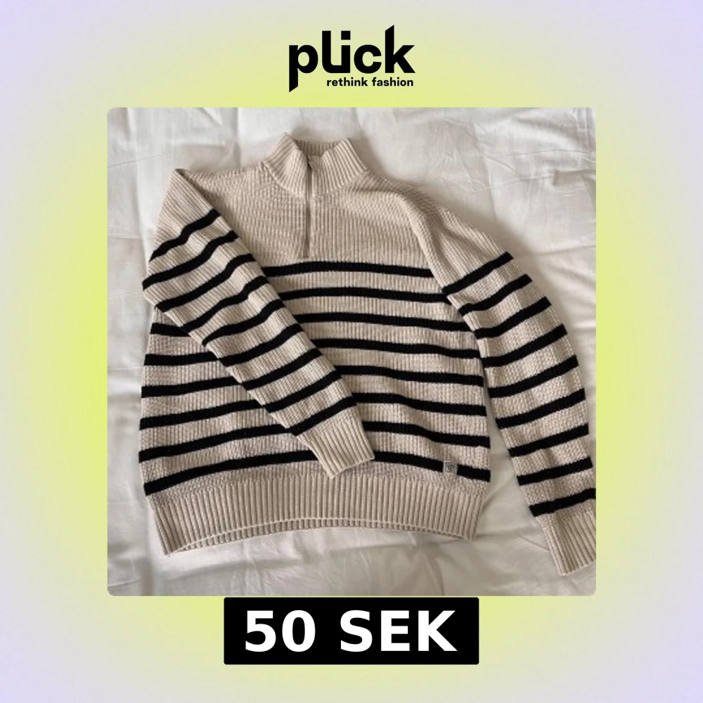 Beige och svart randig stickad tröja från Gekås Ullared i SRNHLT med half zip och hög krage. Tröjan har långa ärmar och ribbade muddar. Funkar året runt.