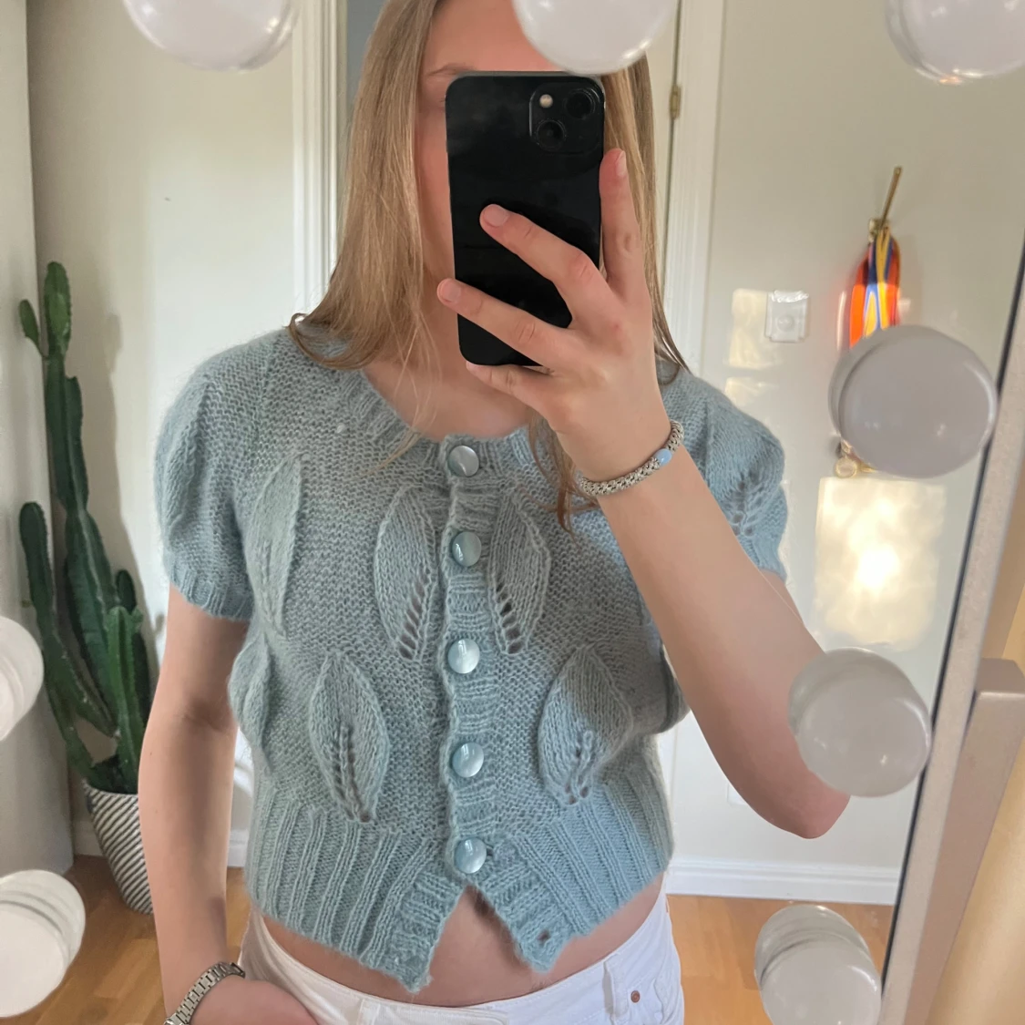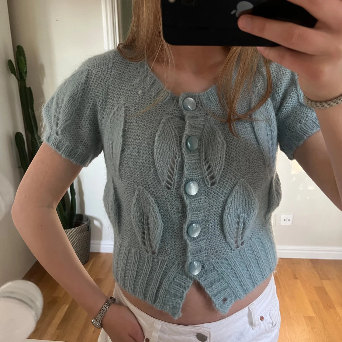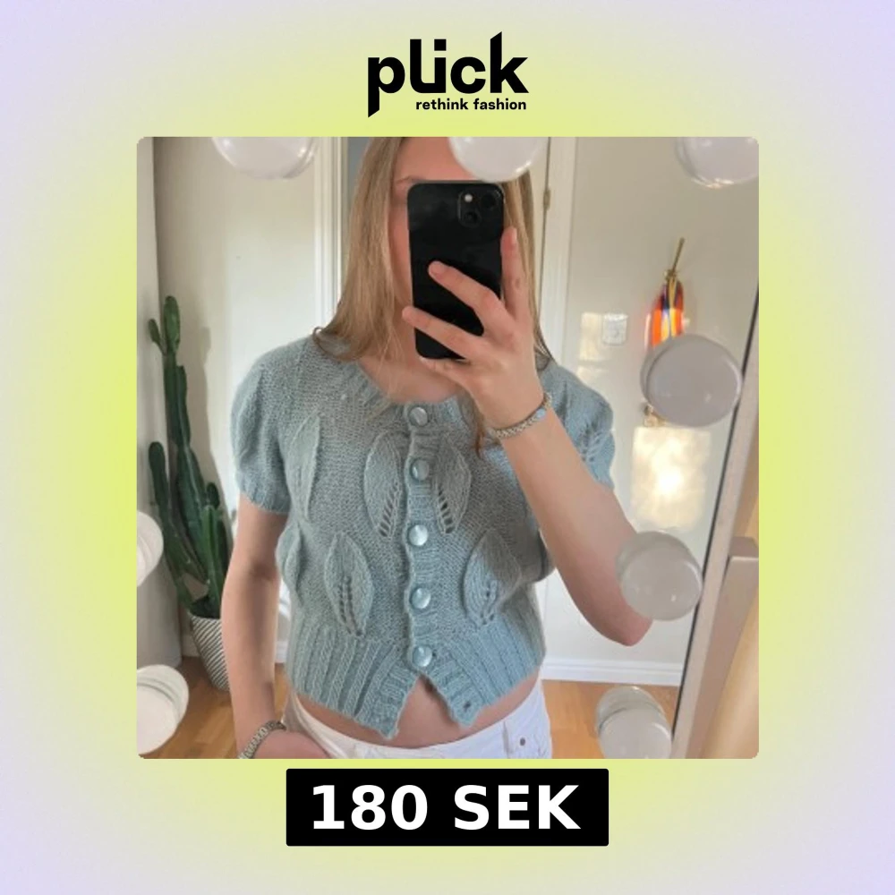 Stickad kortärmad kofta från Hm i strl 38 men liten i strl. En knapp har lossnat längst ner
