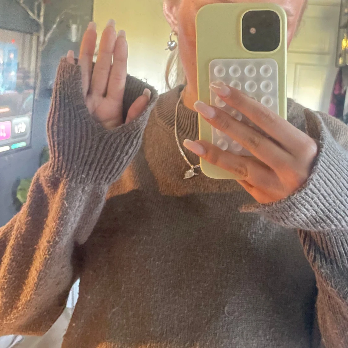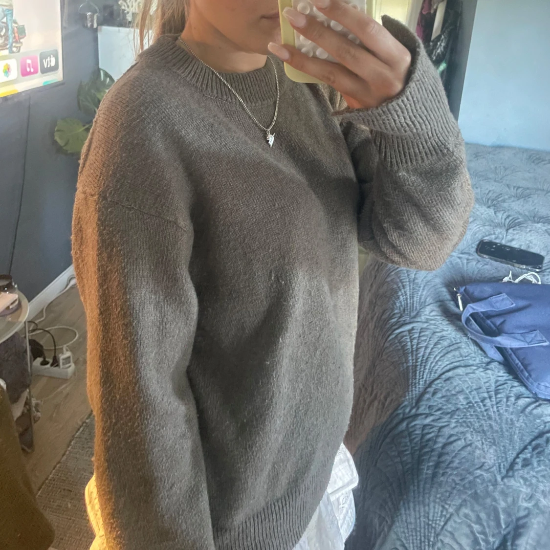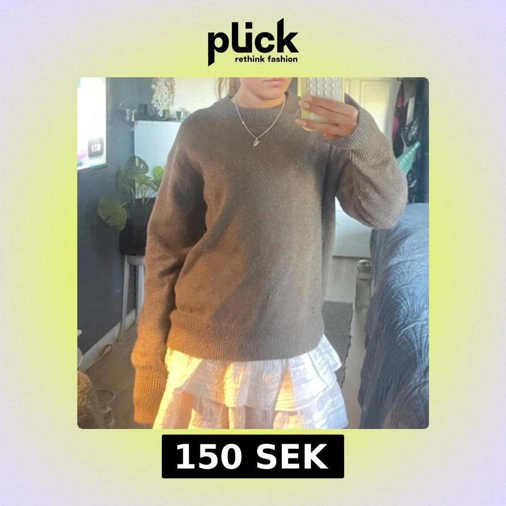Säljer min stickade gröna tröja från H&M. Lite använd men går att ta bort med en liten nopper verktyg enkelt. Har slits vid händerna som design. Köpt för 400kr. 🩵